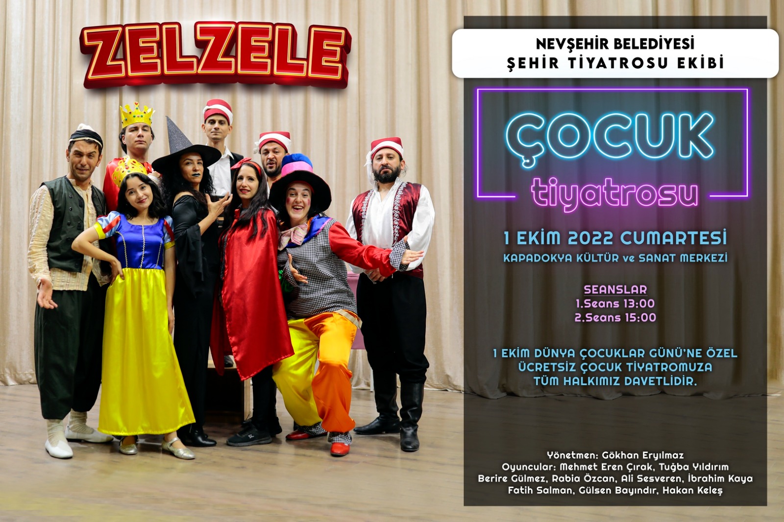 Nevşehir Belediyesi Kültür ve Sosyal İşler Müdürlüğü bünyesinde amatör olarak faaliyetlerini sürdüren Şehir Tiyatrosu, 1 Ekim Dünya Çocuk Günü’nde, “Zelzele” adlı çocuk oyunu ile çocukları kahkahaya boğacak. Yönetmenliğini Gökhan Eryılmaz’ın yaptığı oyun 1 Ekim Cumartesi günü Kapadokya Kültür ve Sanat Merkezi’nde sahnelenecek. 13.00 ve 15.000 saatlerinde iki seans olarak oynanacak tek perdelik oyunu çocuklar ücretsiz olarak izleyebilecek.