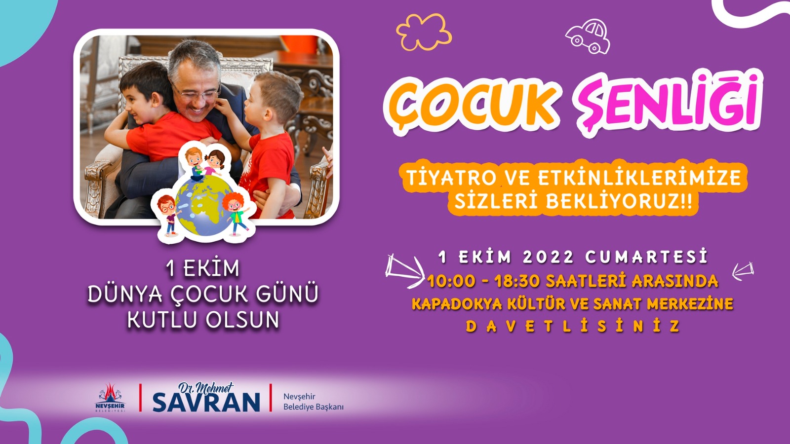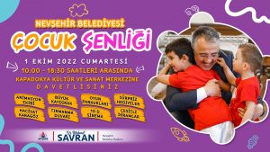 Nevşehir Belediyesi Kültür ve Sosyal İşler Müdürlüğü tarafından 1 Ekim 2022 Cumartesi günü 10.00 ile 18.30 saatleri arasında Kapadokya Kültür ve Sanat Merkezi bahçesinde Çocuk Şenliği düzenlenecek. Birbirinden eğlenceli aktivitelerin düzenleneceği çocuk şenliğinde Nevşehirli çocuklar doyasıya eğlenerek aileleri ile birlikte unutulmaz bir güne imza atacak. Şenlikte; Hacivat Karagöz, Akrobasi Gösterileri, 10 D Mobil Sinema, Dart, Basketbol ve Futbol Oyun Parkurları, Tırmanma Duvarı, Palyaço, Sokak Oyunları, Maskot gibi aktiviteler yer alacak.