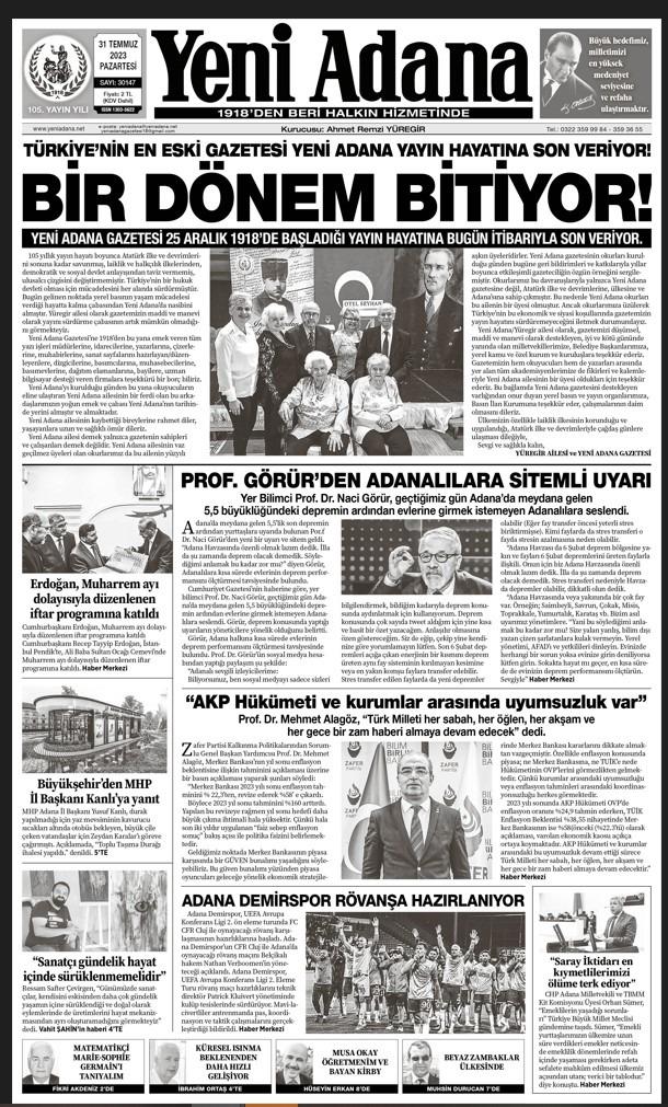 Anadolu basınında en uzun süre yayın yapan gazeteler arasında yer alan Yeni Adana gazetesi son sayısında “BİR DÖNEM BITTİ ” başlığı ile yayın hayatına son verdiğini duyurdu.