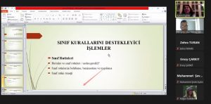 NEVEMM Müdür Yardımcısı Arş. Gör. M. Talha Özalp’in moderatörlüğünde çevrim içi olarak gerçekleştirilen webinarda Doç. Dr. Aysun Erginer, sınıf ve derslik kavramlarını tanıttıktan sonra sınıf yönetimi hakkında bilgiler sundu.