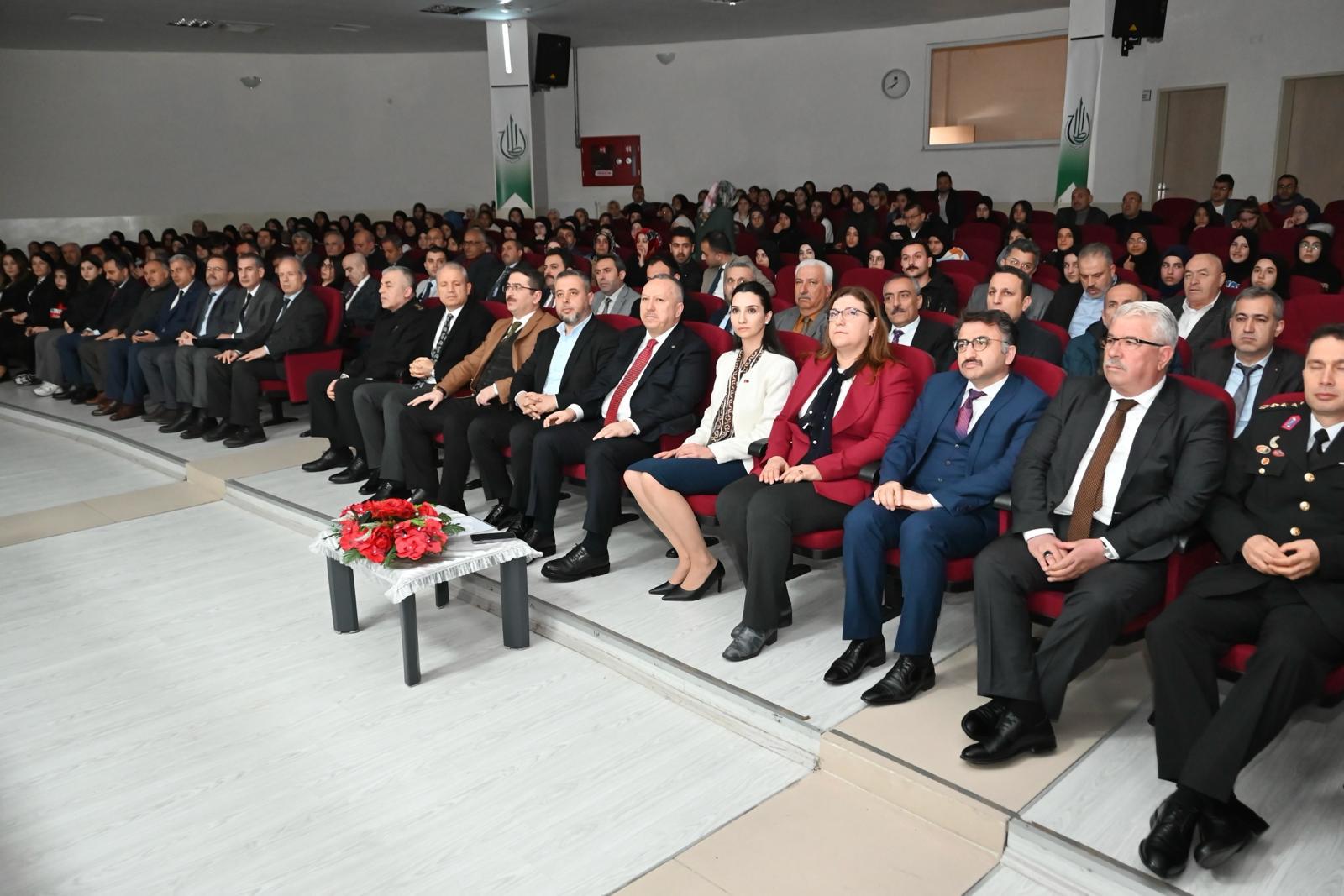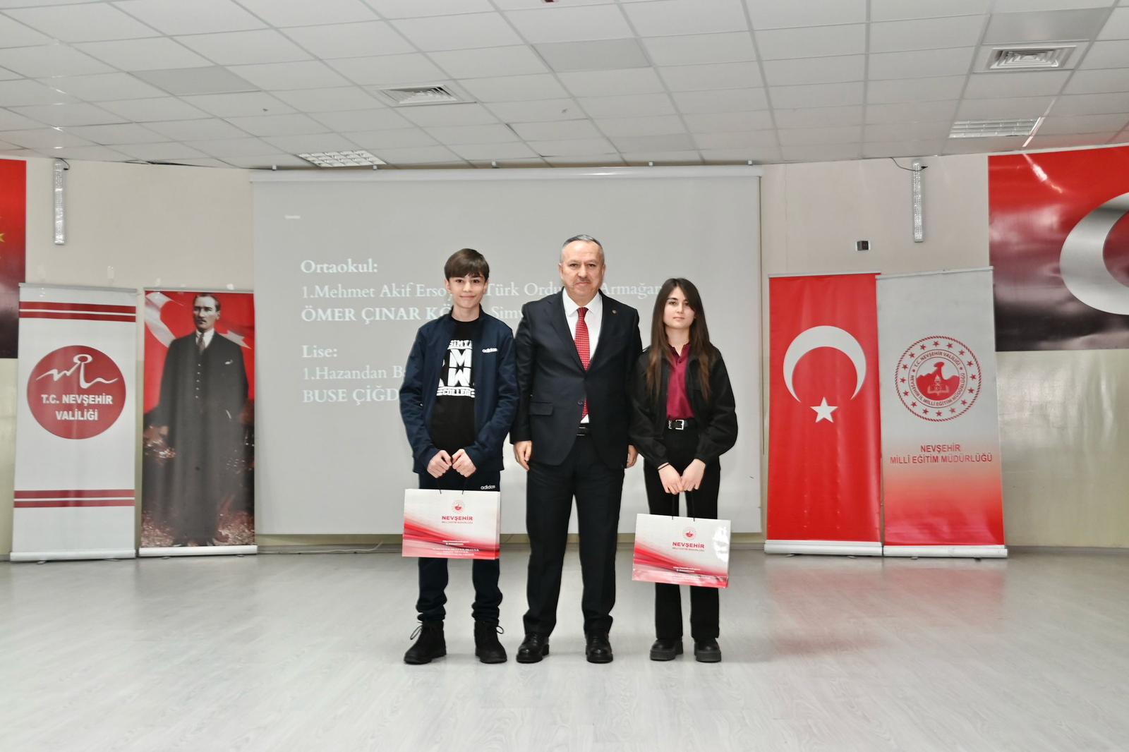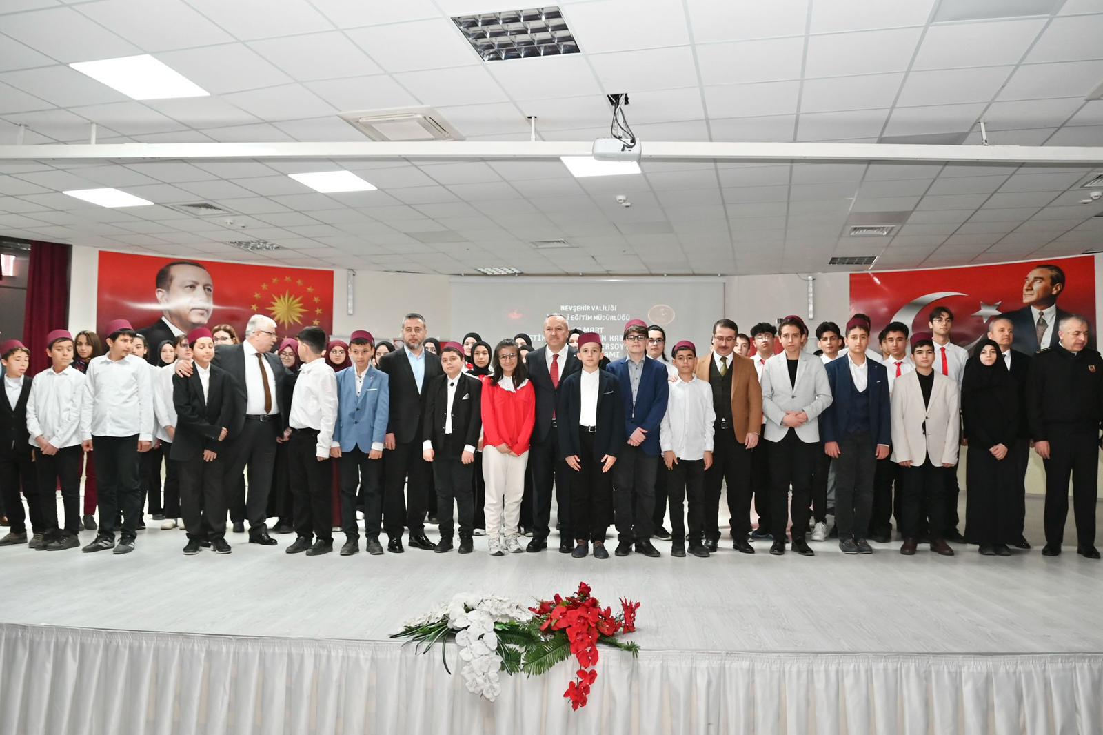 Nevşehir Valisi Ali FİDAN, Milletvekili Süleyman ÖZGÜN, Nevşehir Cumhuriyet Başsavcısı İsmet ÇINAR, Vali Yardımcıları Kübra KARAALİOĞLU ve Hüseyin ÇAM, İl Jandarma Komutanı J. Kd. Albay Bahittin Murat YAKIN, İl Emniyet Müdürü Ali LOĞOĞLU, JAKEM Komutanı J. Albay İlyas UYSAL, NEVÜ Rektör Yardımcısı Prof. Dr. Özlem FINDIK, İl Milli Eğitim Müdürü Yusuf YAZICI, İl protokolü; “İstiklal Marşı’mızın kabulünün 103. yıldönümü ve Milli Şairimiz Mehmet Akif ERSOY’u Anma Günü” nedeniyle düzenlenen programa katıldılar. Recep Tayyip Erdoğan Proje Anadolu İmam Hatip Lisesinde gerçekleşen programda ilk olarak Vali Fidan İl protokol üyeleri ve İl Milli Eğitim Müdürü; İstiklal Marşı’mızın kabulünün 103. yıldönümü ve Mehmet Akif ERSOY’u Anma Günü adına oluşturulan sergiyi gezdiler. İstiklal Marşı’mızın okunması ve saygı duruşu ile başlayan program, Kuran-ı Kerim tilaveti ile devam etti. Günün anlam ve önemine ilişkin konuşmanın yapıldığı, öğrenciler tarafından hazırlanan şiirlerin okunduğu, tiyatro oyununun ve Mehmet Akif ERSOY’un şiirlerinden alıntılarla oluşturulmuş oratoryonun sahnelendiği çeşitli etkinliklerle devam eden program, çeşitli yarışmalarda dereceye giren öğrencilere ödüllerinin takdim edilmesi ile sona erdi.