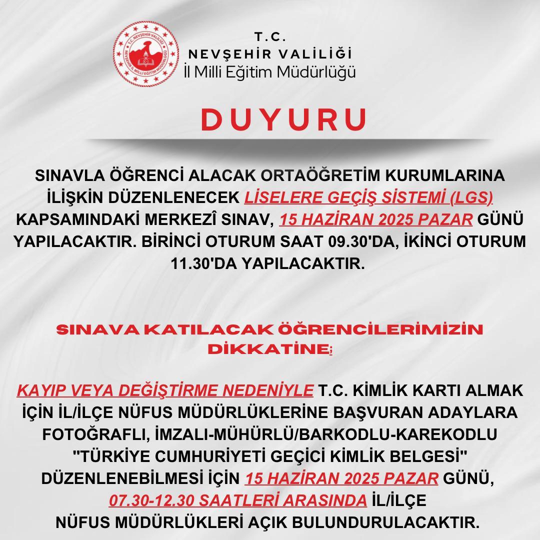 Sınava katılacak öğrencilerin dikkatine; “Kayıp veya değiştirme nedeniyle T.C. Kimlik Kartı almak için il/ilçe nüfus müdürlüklerine başvuran adaylara fotoğraflı, imzalı-mühürlü/barkodlu-karekodlu “Türkiye Cumhuriyeti Geçici Kimlik Belgesi” düzenlenebilmesi için 15 Haziran 2025 Pazar günü,07.30-12.30 saatleri arasında il/ilçe nüfus müdürlükleri açık bulundurulacak.