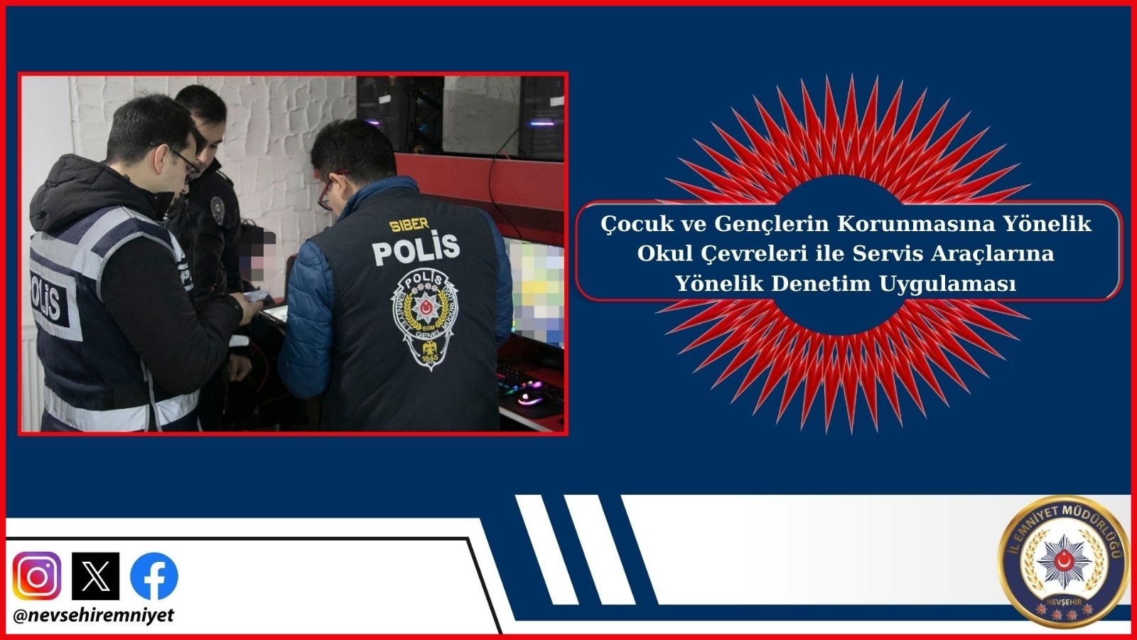 Çocuk ve gençlerin korunmasına yönelik okul çevreleri denetim uygulaması sürüyor. İlimiz geneli, tüm ilkokul, ortaokul, lise, üniversite ve öğrenci yurtlarının yakın çevrelerinde okulla ilişkisi bulunmayan şüpheli şahıslara yönelik ve bu yerlerin yakınındaki park ve bahçeler, metruk binalar, alkol ve tütün mamulleri satılan yerler, iddia ve ganyan bayileri, kahvehaneler, internet ve elektronik oyun salonları, vb. yerlerde, çocuk ve gençlerin korunmasına yönelik yapılan uygulamada; 173 okul çevresi, 569 kişi, 29 işyeri, 123 park bahçe, 29 metruk bina, 54 araç ve 75 okul servis aracı kontrol edildi.