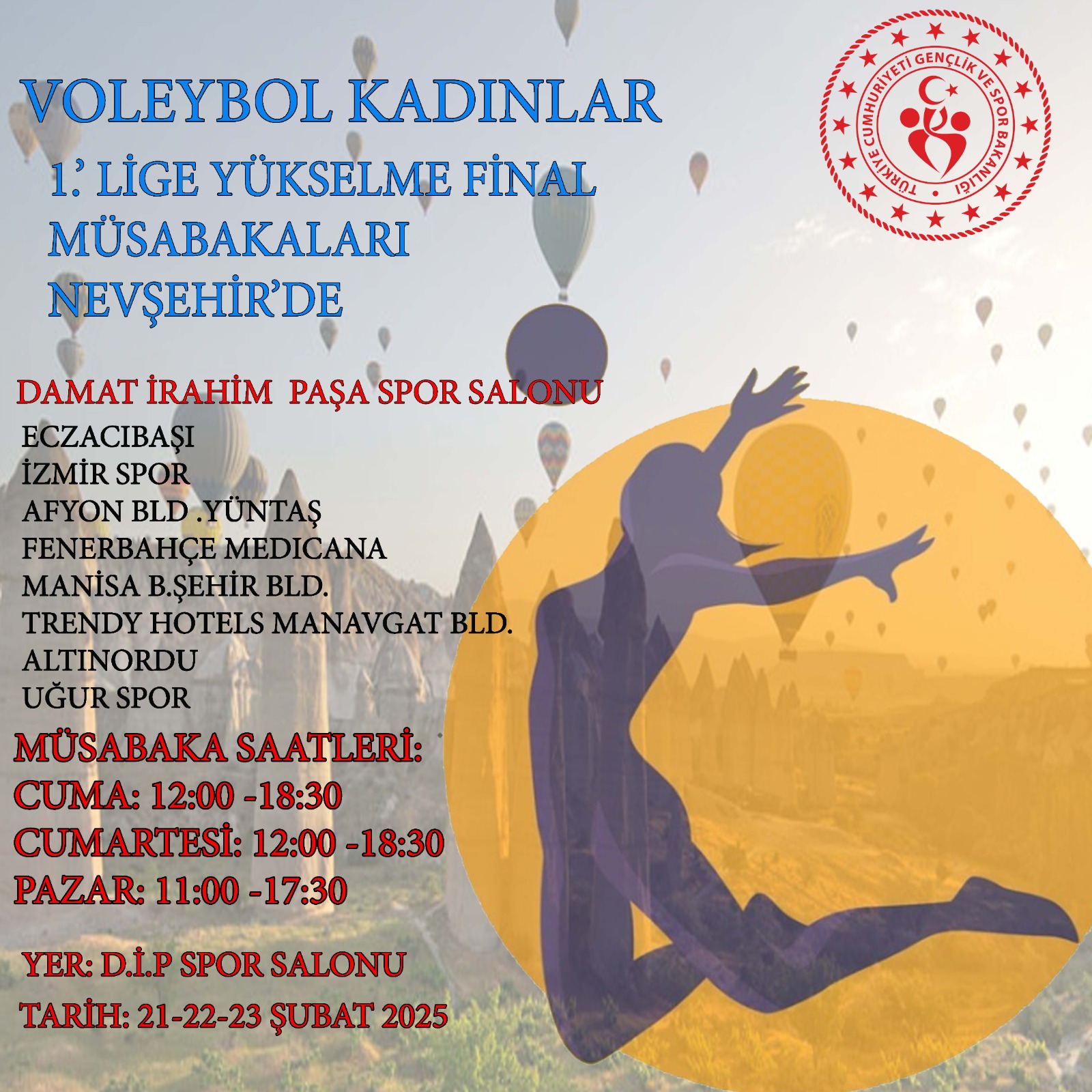 Türkiye Voleybol Federasyonunun 2025 yılı faaliyet programında yer alan Voleybol Kadınlar 1.Lig’e yükselme final müsabakaları 21-22-23 Şubat 2025 tarihlerinde Nevşehir’de (Damat İbrahim Paşa Spor Salonu) oynanacak.