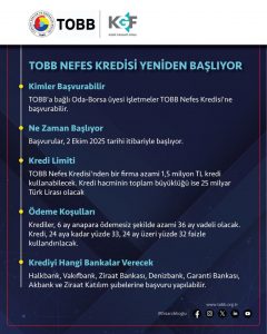 Başkan Parmaksız, açıklamasında TOBB’a bağlı oda ve borsa üyesi işletmelerin bu imkândan faydalanabileceğini belirterek, “Ekonomik olarak işletmelerimize can suyu olacak Nefes Kredisi, üyelerimiz için büyük bir fırsat sunuyor” dedi.