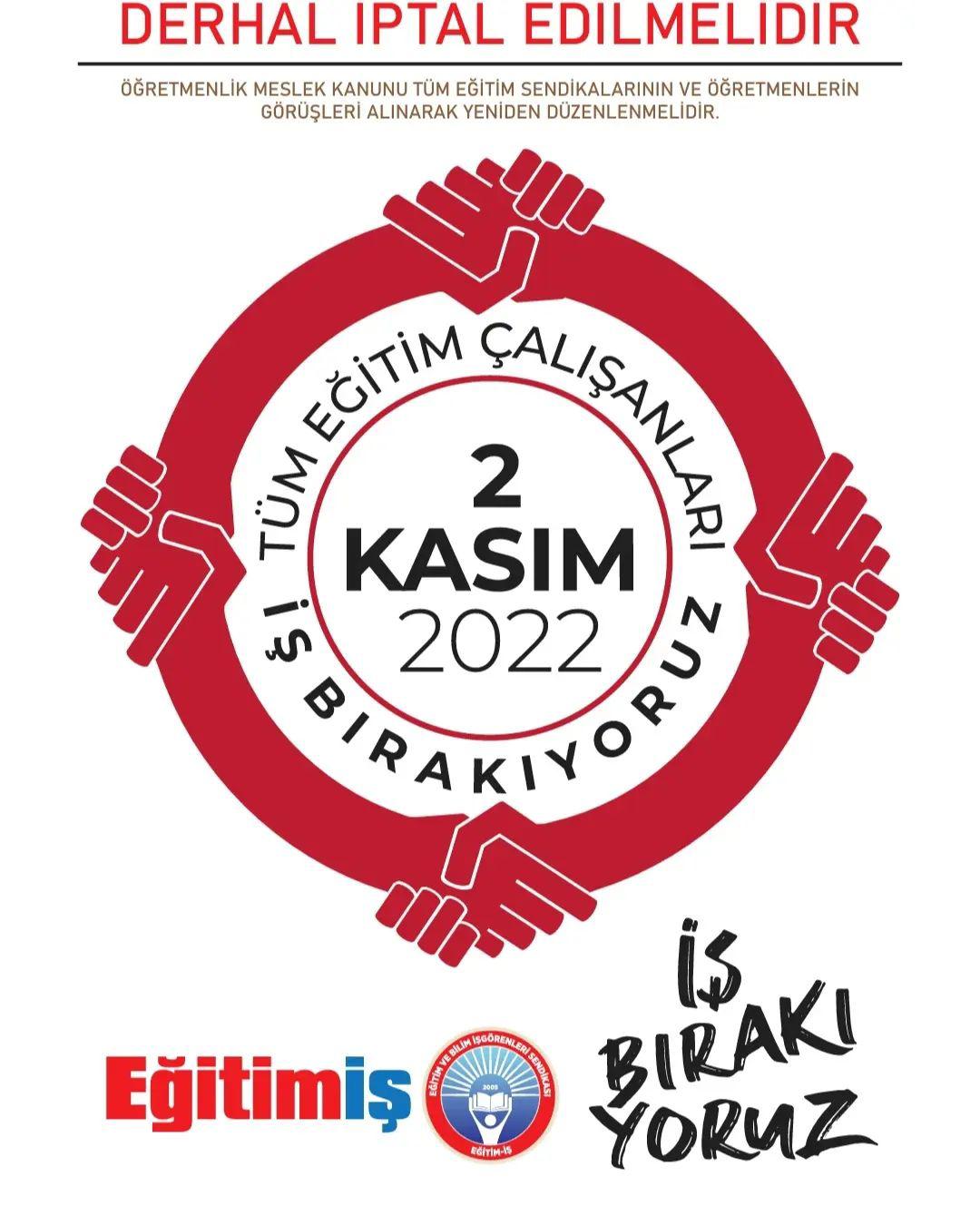 Demir, “Öğretmenlik Meslek Kanunu’na karşı harekete geçiyoruz. Hepinizin bildiği gibi teslim edilmesi gereken haklarımızı yeni ve keyfi şartlara bağlayan, ezbere dayalı bir sınav sonucunda zaten ücretli, sözleşmeli, kadrolu olarak ayrıştırılmış olan bizi yeni sıfatlarla bir kez daha ayrıştıracak olan, okullarda çalışma barışını bozacak ve öğretmenin mesai saat dışındaki vaktini de gasp etmeye niyetli bu kanun, sadece eğitim çalışanları açısından değil, tüm eğitim sistemi açısından büyük bir tehdittir. Bizler birer öğretmen sorumluluğuyla, sadece bu kanuna karşı değil, eğitimin ve eğitim çalışanının kronikleşen sorunlarına karşı sesimizi yükseltiyor, irade gösteriyoruz. Ve üretimden gelen gücümüzü kullanarak uyarı niteliğinde bir eyleme imza atıyor ve 2 Kasım’da 1 gün süreyle iş bırakıyoruz. Tüm eğitim çalışanlarını da bu eyleme katılmaya davet ediyoruz” dedi.