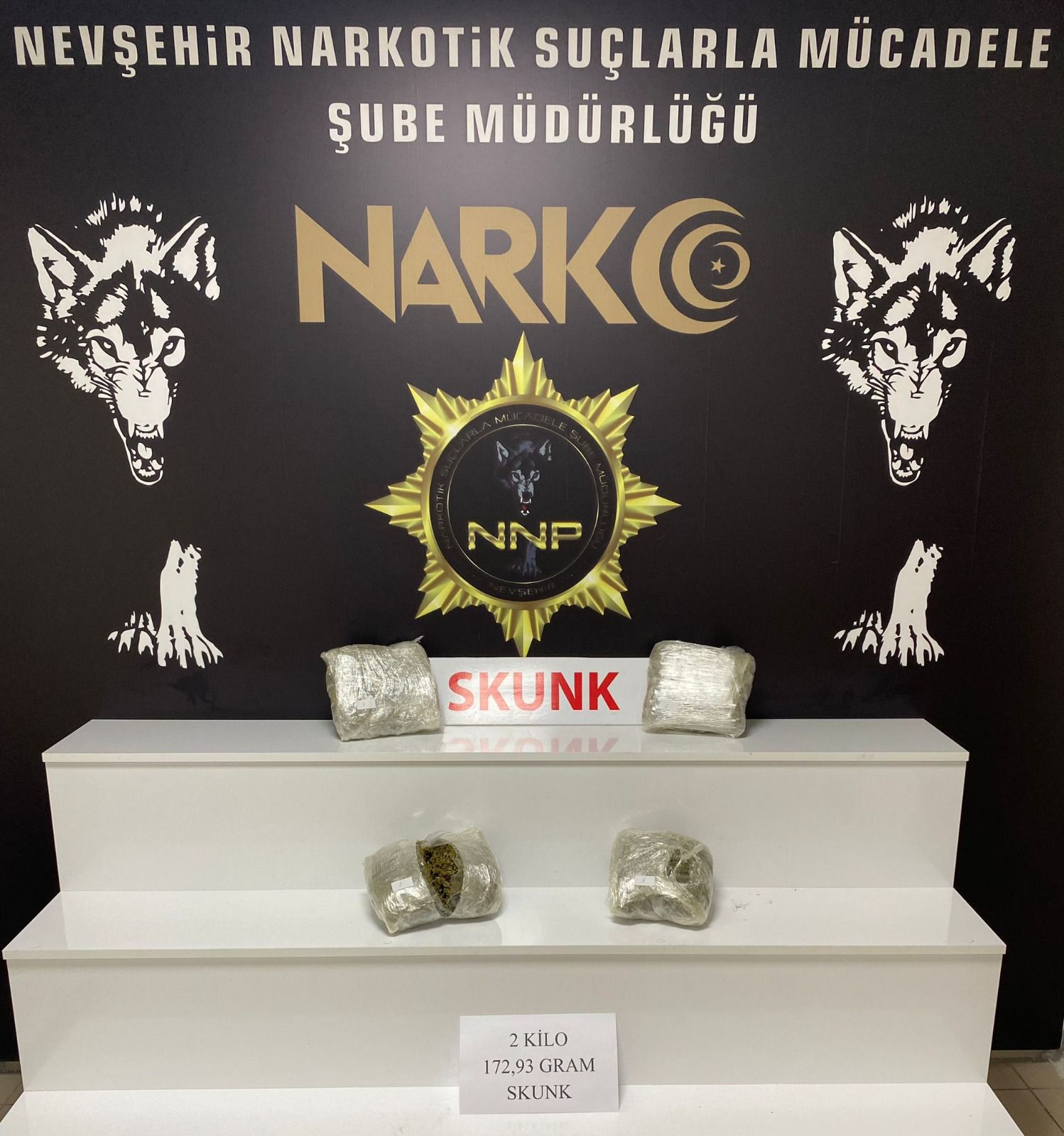 Nevşehir Narkotik Suçlarla Mücadele Şube Müdürlüğü ekipleri tarafından 2 kilo uyuşturucu ele geçirildi. Uyuşturucu ticareti yapan şahısların deşifresine yönelik yapılan çalışmada, 2 Kg 173 gr Skung yakalandı. Yakalanan 2 şüpheli şahıs gerekli işlemlerinin ardından adli mercilere sevk edilirken tutuklanarak cezaevine teslim edildi.