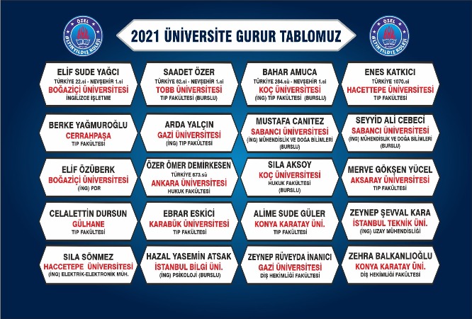 Yerleştirme sonuçlarının açıklanmasıyla listelerimizi şeffaf bir şekilde kamuoyuyla paylaşılmış, Türkiye’nin en seçkin üniversitelerine şampiyon öğrencilerimiz yerleşmişlerdir.