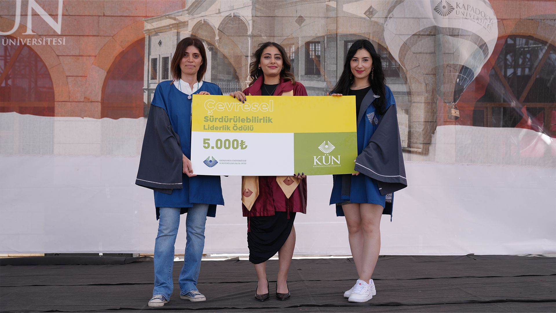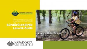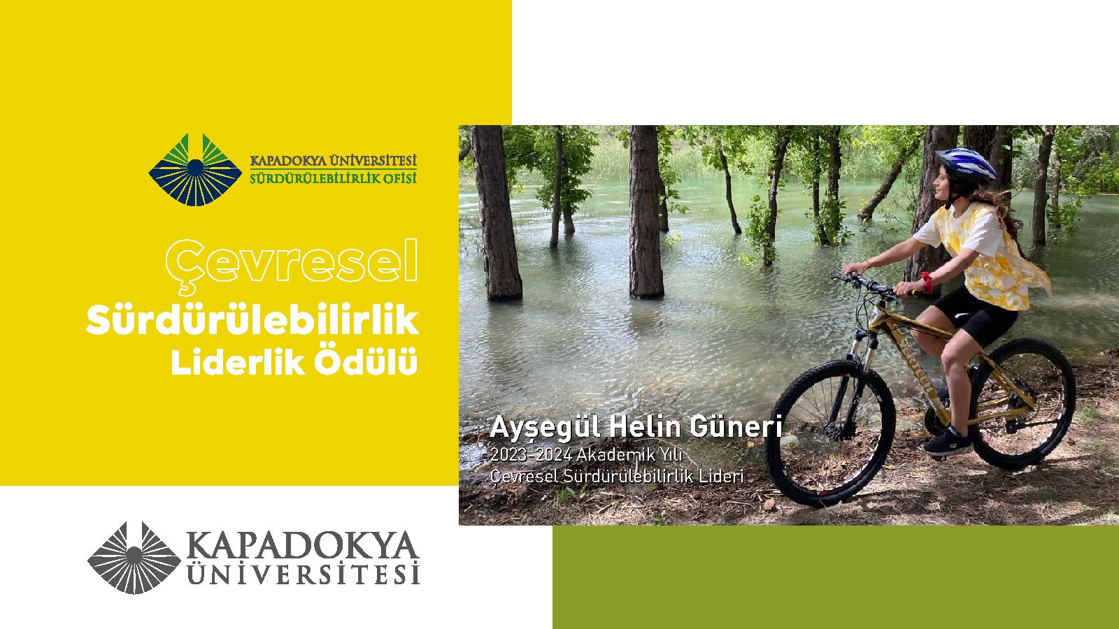 Kapadokya Üniversitesi sürdürülebilirlik çalışmaları kapsamında, 2021-2022 akademik yılından bu yana geleneksel olarak her yıl bir öğrencimize verilmekte olan Kapadokya Üniversitesi Çevresel Sürdürülebilirlik Liderlik Ödülü, üniversite eğitimi boyunca, çevresel sürdürülebilirlik çalışmalarına katılım sağlamak ve ekolojik duyarlılığın geliştirilmesine yönelik bilinçlendirme faaliyetleri yürütmek konularında üstün başarı göstermiş olan son sınıf öğrencilerini desteklemeyi ve bu bağlamda üniversitemiz tarafından ekolojik duyarlılığa sahip öğrenciler yetişmesini teşvik etmeyi amaçlamaktadır. Ödülün bu yılki sahibi, Kapadokya Üniversitesi, Beşeri Bilimler Fakültesi, Psikoloji Bölümü 4. sınıf öğrencisi Ayşegül Helin Güneri oldu.