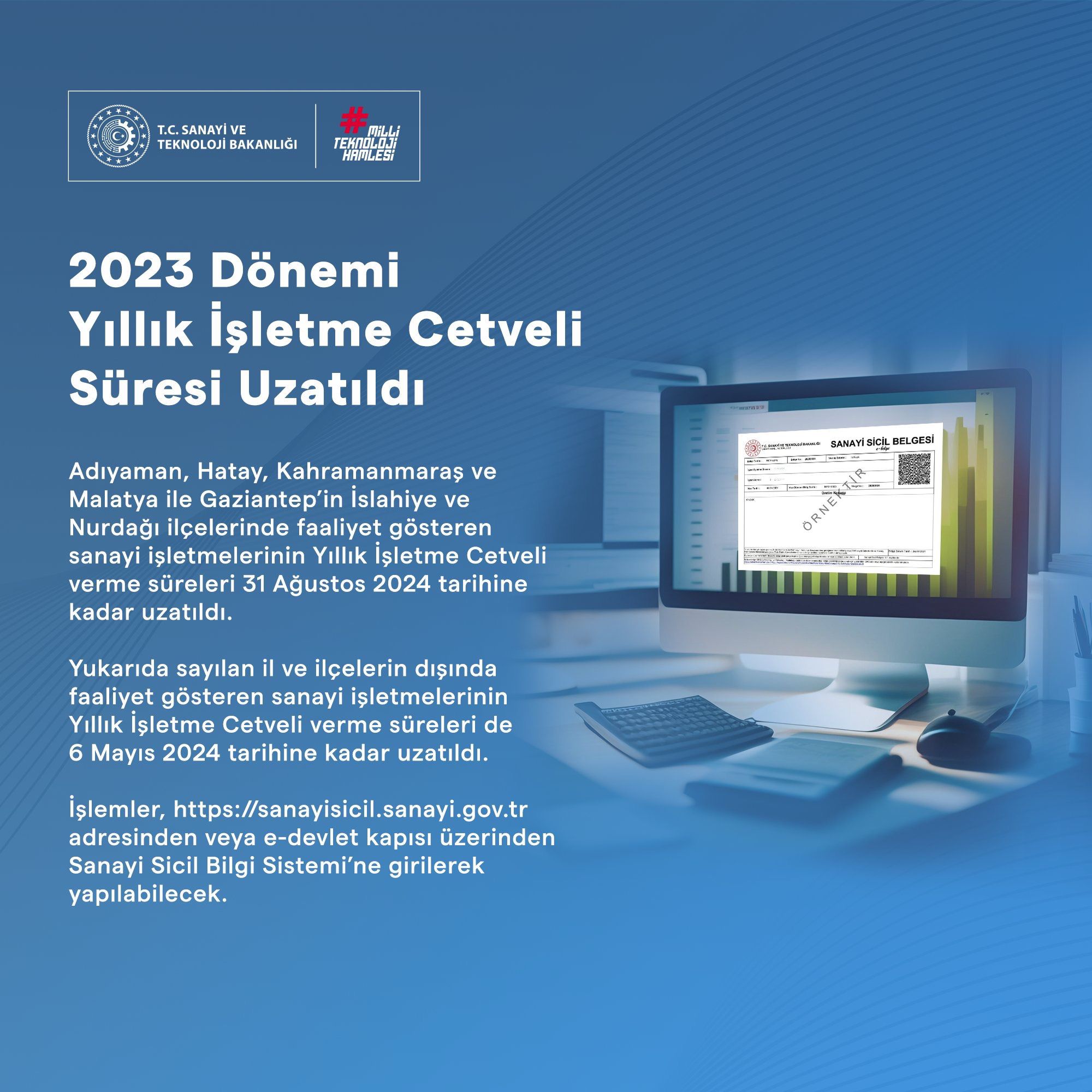 Yukarıda sayılan il ve ilçelerin dışında faaliyet gösteren sanayi işletmelerinin Yıllık İşletme Cetveli verme süreleri de 6 Mayıs 2024 tarihine kadar uzatıldı.