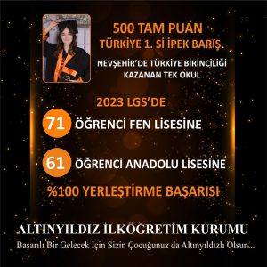 Altınyıldız Ortaokulu öğrencileri Türkiye’nin en iyi liselerine yerleştiler. Nevşehir’in tek Türkiye birincisi İpek BARIŞ 2023 LGS yerleştirme sonuçlarına göre 500 tam puan alarak Robert Koleji’ni kazanmıştır. Yerleştirme sonuçlarına göre;