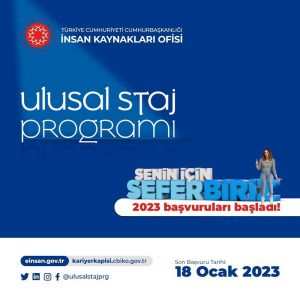 T.C. Cumhurbaşkanlığı İnsan Kaynakları Ofisi Başkanlığı tarafından duyurusu yapılan Sayın Cumhurbaşkanımızın “e-insan” tanıtım töreninde açıkladığı üzere, 2023 yılı “Ulusal Staj Programı” öğrenci başvuruları 18.10.2022 tarihinde başlamış olup 18.01.2023 tarihine kadar devam edecektir.