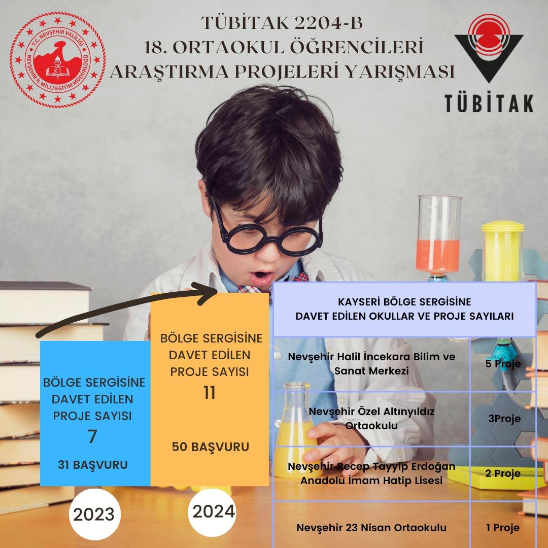 TÜBİTAK Bilim İnsanı Destek Programları Başkanlığı (BIDEB) tarafından ortaokul öğrenimine devam etmekte olan öğrencileri temel, sosyal ve uygulamalı bilim alanlarında çalışmalar yapmaya teşvik etmek, çalışmalarını yönlendirmek ve mevcut bilimsel çalışmalarının gelişimine katkı sağlamak amacıyla düzenlenen “2204-B Ortaokul Öğrencileri Araştırma Projeleri Yarışması” düzenlenmektedir. Bu kapsamda 2024 yılına ait ilimizden toplam 50 proje başvurusu yapılmıştır. İlimizden yapılan 50 başvurudan 11’i Kayseri bölge sergisine davet edilmiştir. Bölge proje sergisi ve ödül töreni, 22-25 Nisan 2024 tarihleri arasında yapılacaktır.