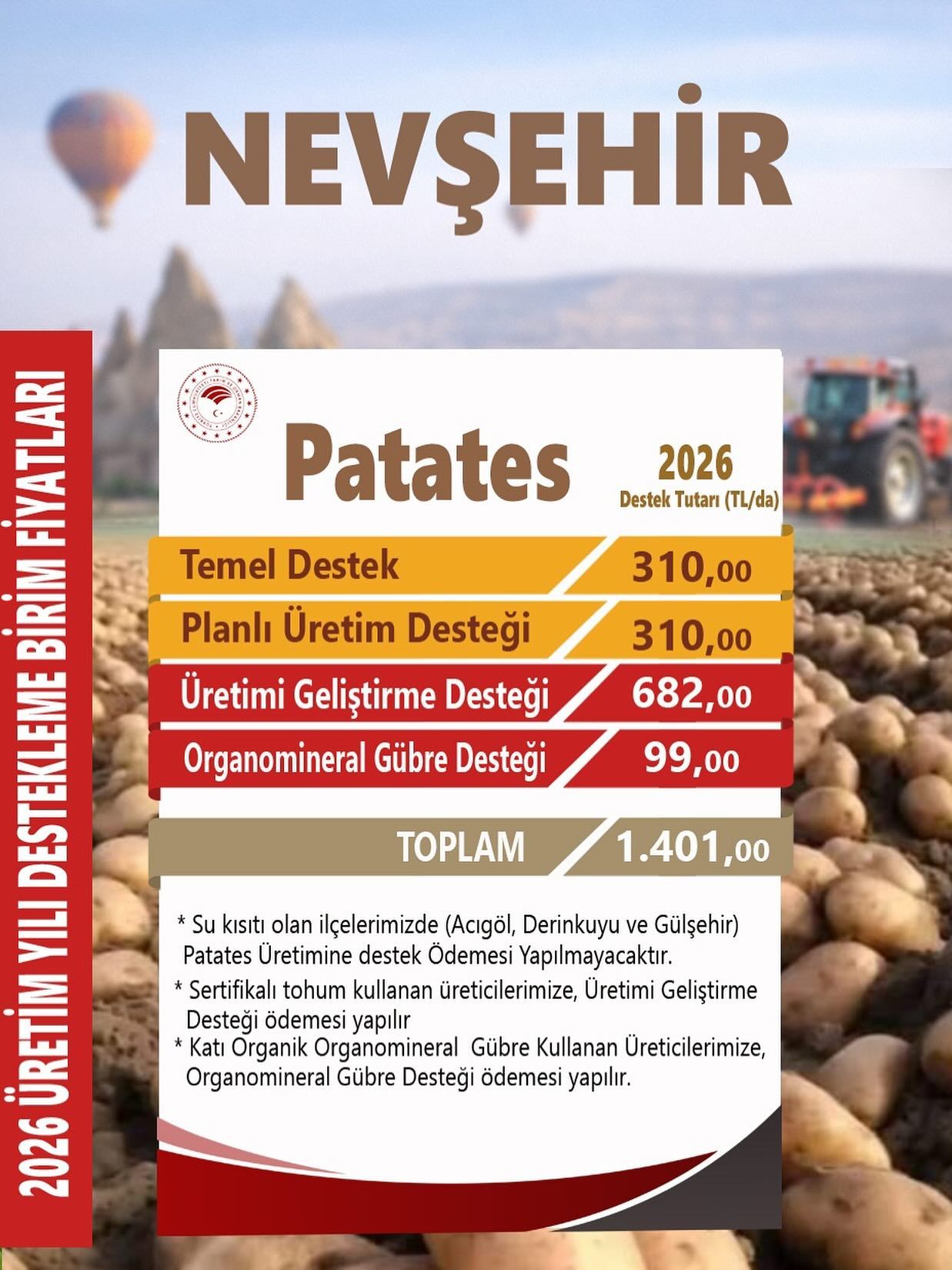 Nevşehir İl Tarım ve Orman Müdürlüğü tarafından yapılan açıklamada, 2026 üretim yılı patates destekleme tutarları kamuoyu ile paylaşıldı.
