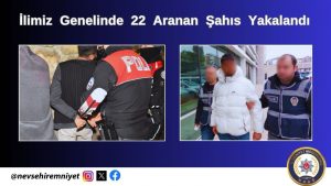 Nevşehir Emniyet Ekipleri tarafından son bir hafta içerisinde ilimiz genelinde aranan şahısların yakalanmasına yönelik yapılan çalışmalarda 22 kişi yakalandı. 20 yıl 1 ay kesinleşmiş hapis cezası bulunan 1 şahıs, 12 yıl 6 ay kesinleşmiş hapis cezası bulunan 1 şahıs, 3 yıl 1 ay 15 gün kesinleşmiş hapis cezası bulunan 1 şahıs, 2 yıl 6 ay kesinleşmiş hapis cezası bulunan 1 şahıs ve 2 yıl 1 ay kesinleşmiş hapis cezası bulunan 1 şahıs, başta olmak üzere çeşitli suçlardan aranması bulunan 22 şahıs yakalandı. Çıkarılmış oldukları adli mercilerce 11 şahıs serbest bırakılırken 11 şahıs tutuklanarak cezaevine teslim edildi.