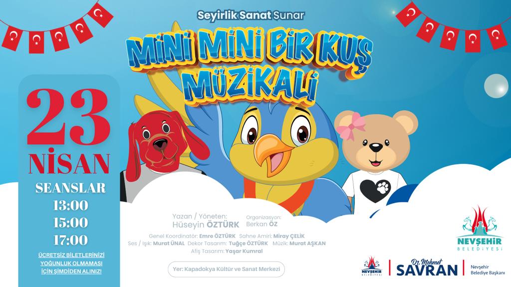 Nevşehir Belediyesi, 23 Nisan Ulusal Egemenlik ve Çocuk Bayramı dolayısıyla gerçekleştireceği Çocuk Şenliği’nin yanı sıra çocuklar için aynı gün “Mini Mini Bir Kuş” müzikalinin ücretsiz olarak sahneleneceğini duyurdu.