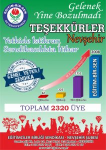 Üye sayısını 2 bin 320’ye çıkararak yeniden Nevşehir ili genelinde yetkiyi kazanmanın sevincini yaşadıklarını belirten Eğitim-Bir-Sen Nevşehir Şube Başkanı Mustafa Çiftci, “2022 Yılında Nevşehir’imizde Yine Yeniden açık ara üye sayısını artırarak Eğitim-Bir-Sen’imiz yetkili sendika olmuştur.
