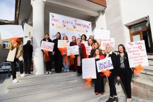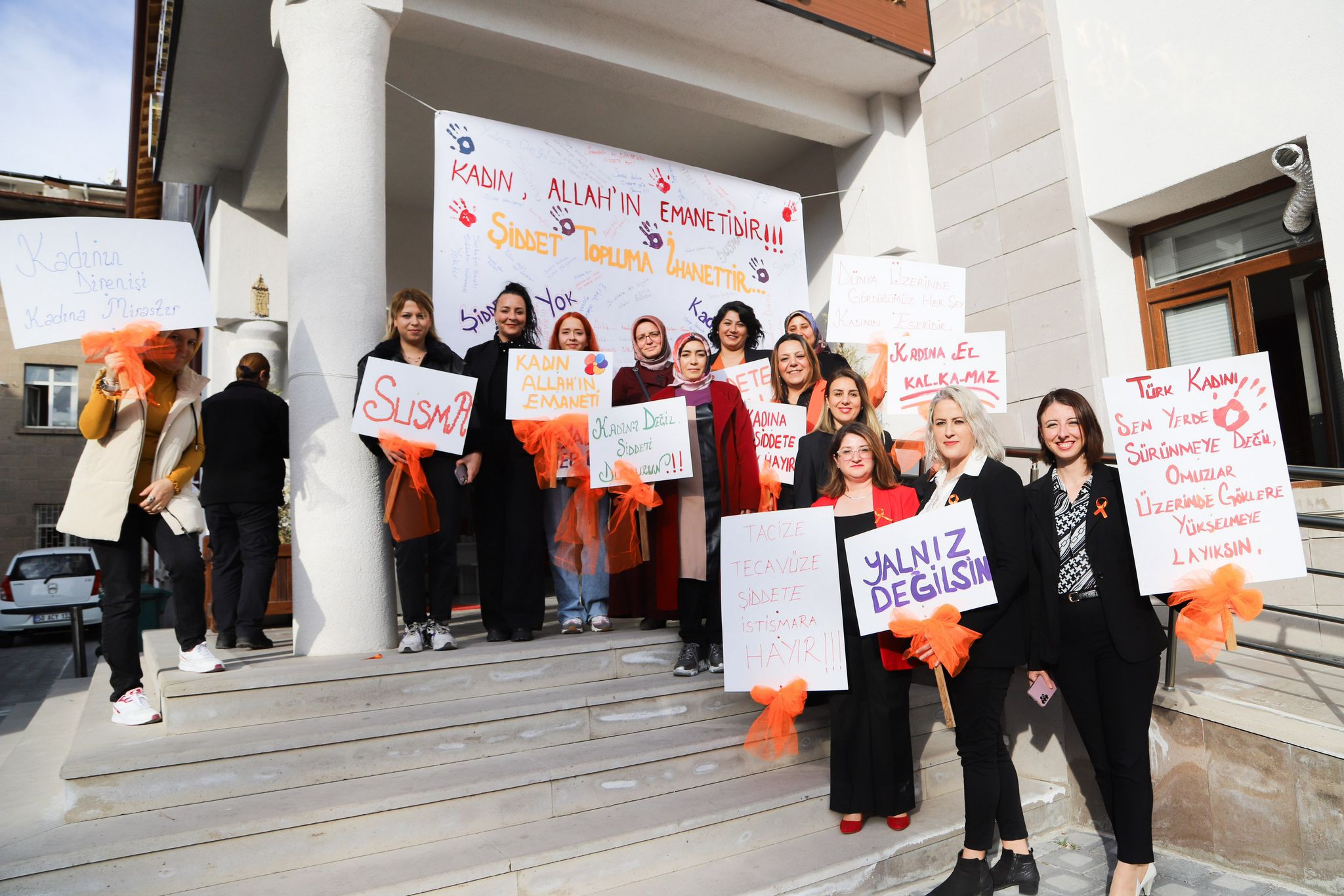 Belediye Başkanı Dr. Mehmet Savran’ın eşi Nejla Savran, Nevşehir Belediyesi Kadın ve Aile Hizmetleri Müdürü Sevinç Sesveren Atılgan ve Kadın Çalışmaları Eğitim Merkezi (KAÇEM) kursiyerlerinin katıldığı programın sonunda kadınlar hep birlikte branda üzerine şiddet ile ilgili düşüncelerini yazarak birlikte fotoğraf çektirdi.