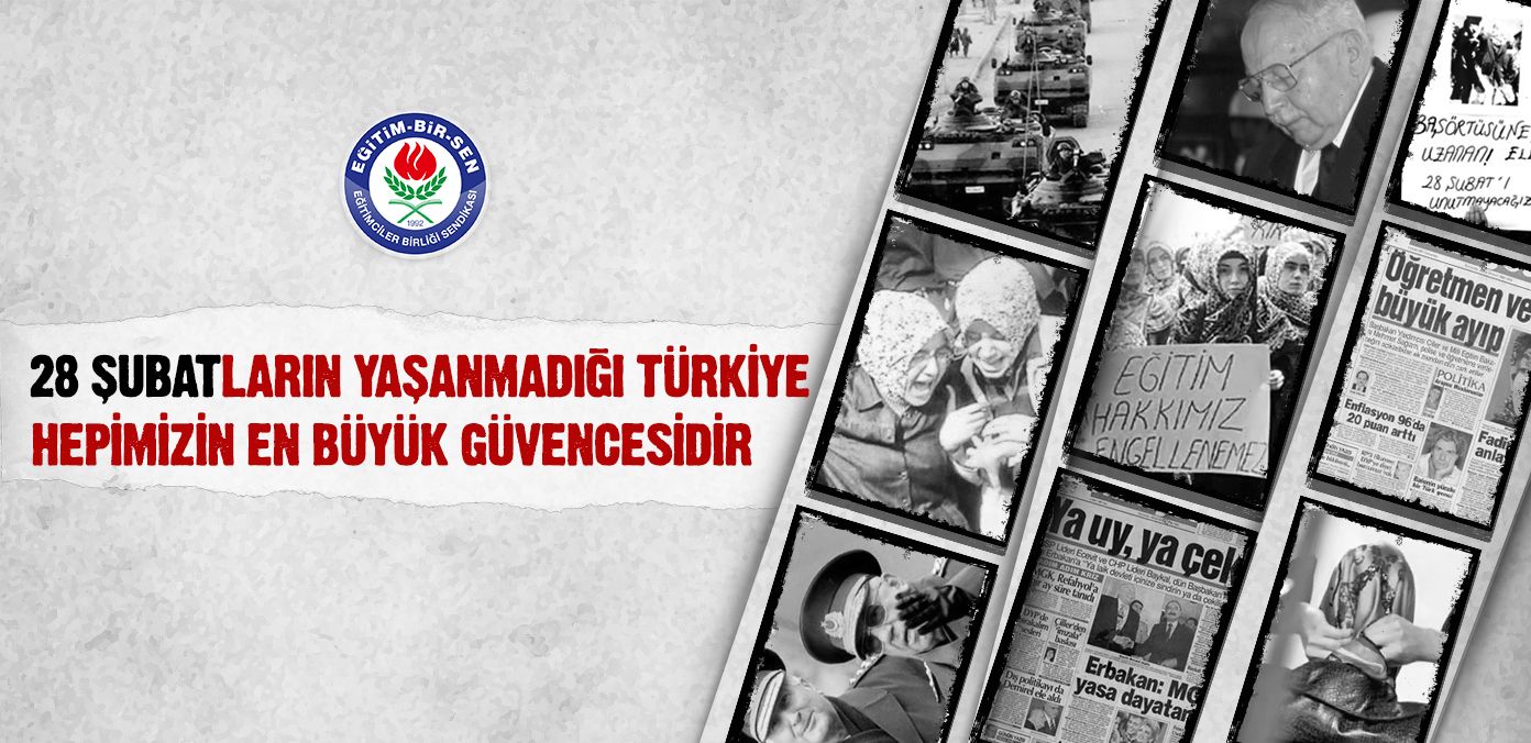 28 Şubat zulmünün mimarlarının yargılanıp, hak ettikleri cezaya çarptırılmaları yeni Türkiye’nin bağımsız gücünü, hak ve adalet hassasiyetini, demokratik olgunluğunu göstermesi bakımından tarihî önemdedir. Ama asıl yargılama ve cezalandırma milletimizin vicdanında gerçekleşmiş, millete düşmanlıktan başka hüneri olmayan bu hainler sürüsü, millet için örmek istedikleri karanlık zindanlarda koyu, derin unutuluşa mahkûm edilmiştir. Ayrıca 28 Şubat’ın askeri kanadı dışında yargılanmayan hatta yeterince bu suçlarıyla gündeme bile getirilmeyen basın, sermaye ve sözde sivil toplum ayaklarının, yer yer bugün bile provokatif söylem ve eylem içinde olması üzücü bir durumdur. Eğitim-Bir-Sen olarak, hep hak ve özgürlükten, millî değerlerden, ülkemizden, insanımızdan yana olduk, olmaya da devam edeceğiz. Bu vesileyle Necmettin Erbakan’ı vefatının 12. yılında rahmetle anıyor; darbecileri ise lanetliyoruz” ifadelerinde bulunuldu.