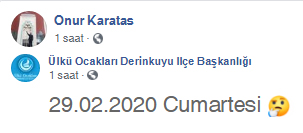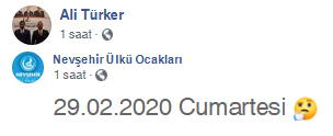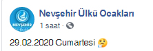 Nevşehir’de ki Ülkücüler gün içerisinde sosyal medya üzerinden 29 Şubat 2020 tarihini işaret ederek düşünceli emojesi ile paylaşımda bulundu.