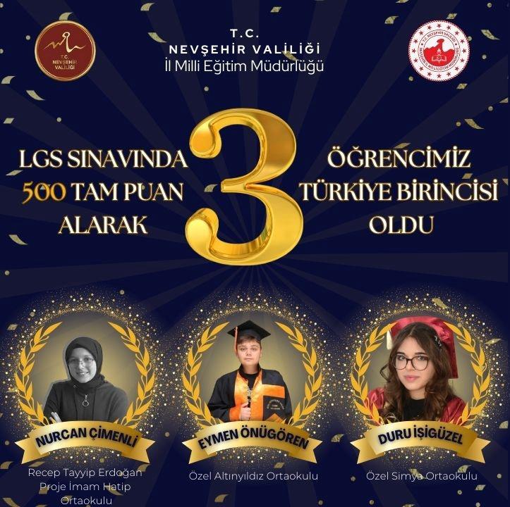 Liselere Geçiş Sistemi (LGS) kapsamında 2 Haziran’da yapılan merkezî sınavda Nevşehir büyük bir başarıyla imza attı. Recep Tayyip Erdoğan Proje İmam Hatip Ortaokulu öğrencisi Nurcan ÇİMENLİ, Özel Altınyıldız Ortaokulu öğrencisi Eymen ÖNÜGÖREN ve Özel Simya Ortaokulu öğrencisi Duru İŞİGÜZEL; 500 tam puan alarak Türkiye 1.si oldular.