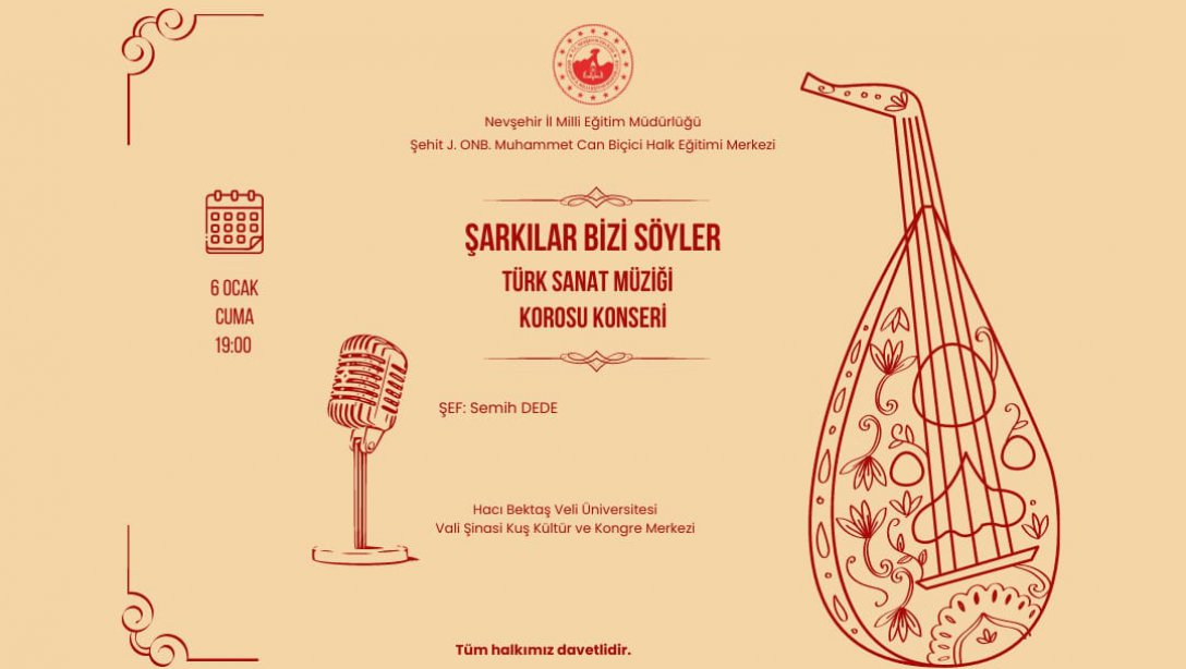 Ekim ayından bu yana çalışmalarına devam eden Gülşehir, Hacıbektaş, Ürgüp ve Merkez İlçe Halk Eğitimi Merkezleri bünyesinde kurs faaliyeti olarak oluşturulan Türk Sanat Müziği Koroları konserlerini Ocak ayı içerisinde verecek. Konserlere tüm halkımız davet edildi.
