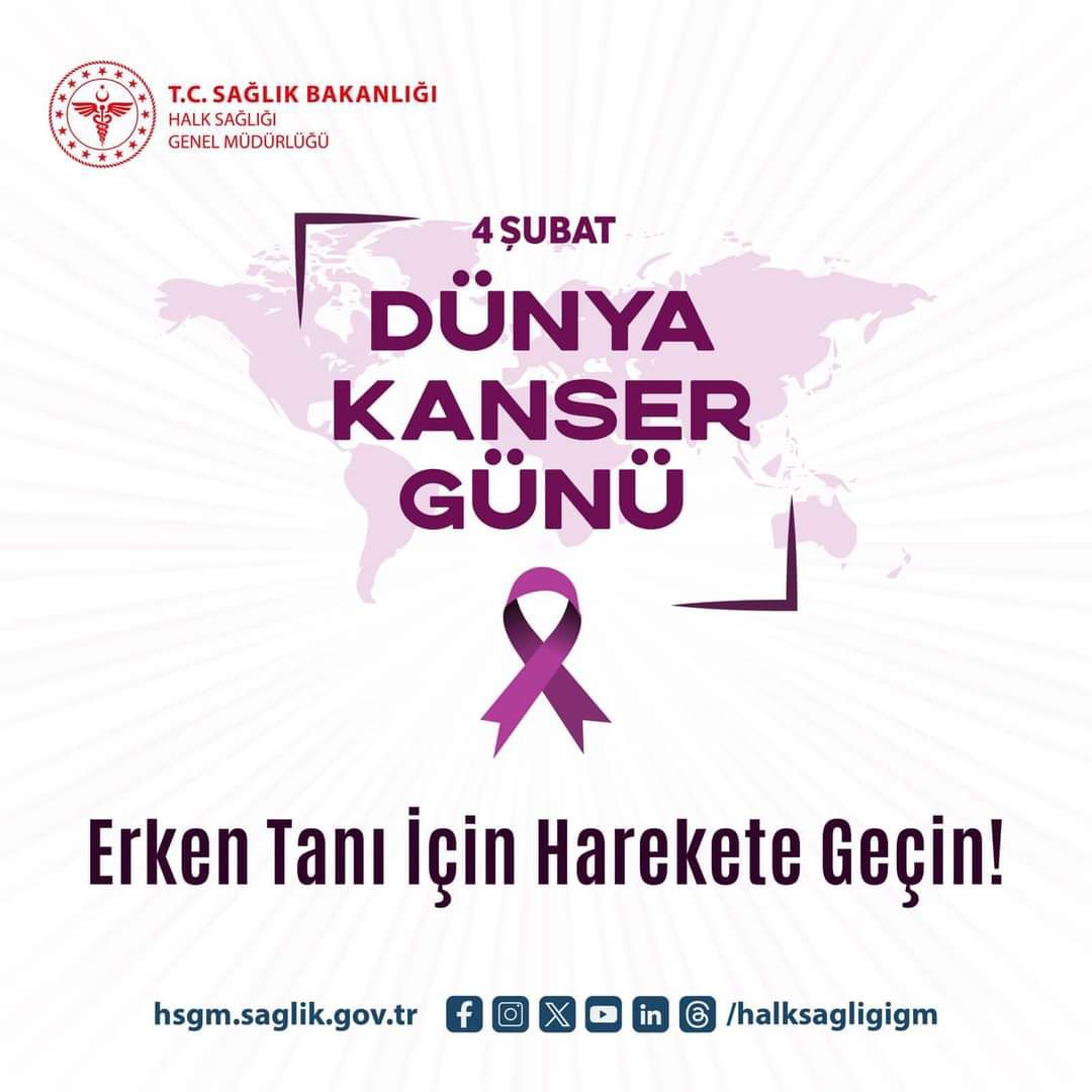 Bakanlık olarak benimsediğimiz “4 Şubat Dünya Kanser Günü” farkındalık mesajımız “Kanserden korunmak herkesin hakkıdır. Siz de kanserden korunmak ve kendinize uygun taramaları yaptırmak için; Toplum Sağlığı Merkezlerine (TSM) bağlı olarak hizmet veren Kanser Erken Teşhis, Tarama ve Eğitim Merkezleri (KETEM), Sağlıklı Hayat Merkezleri (SHM) ve Aile Sağlığı Merkezleri (ASM)’ne başvurabilirsiniz”. Ulusal Kanser Tarama Programları hakkında daha detaylı bilgi Kanser Dairesi Başkanlığına ait web sitesinde mevcuttur. Ayrıca buradan Hangi Tarama Bana Uygun? uygulaması ile hangi kanser türünde tarama yaptırabileceğiniz konusunda bilgi edinilebilmektedir.