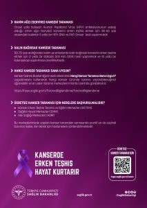 Bakanlık olarak benimsediğimiz farkındalık mesajımız “Kanserden korunmak herkesin hakkıdır. Siz de kanserden korunmak ve kendinize uygun taramaları yaptırmak için; Toplum Sağlığı Merkezlerine (TSM) bağlı olarak hizmet veren Kanser Erken Teşhis, Tarama ve Eğitim Merkezleri (KETEM), Sağlıklı Hayat Merkezleri (SHM) ve Aile Sağlığı Merkezleri (ASM)’ne başvurabilirsiniz”. Ulusal Kanser Tarama Programları hakkında daha detaylı bilgi Kanser Dairesi Başkanlığına ait web sitesinde mevcuttur. Ayrıca burada Hangi Tarama Bana Uygun? uygulaması ile hangi kanser türünde tarama yaptırabileceğiniz ve en yakın tarama merkezleri haritada gösterilmektedir.