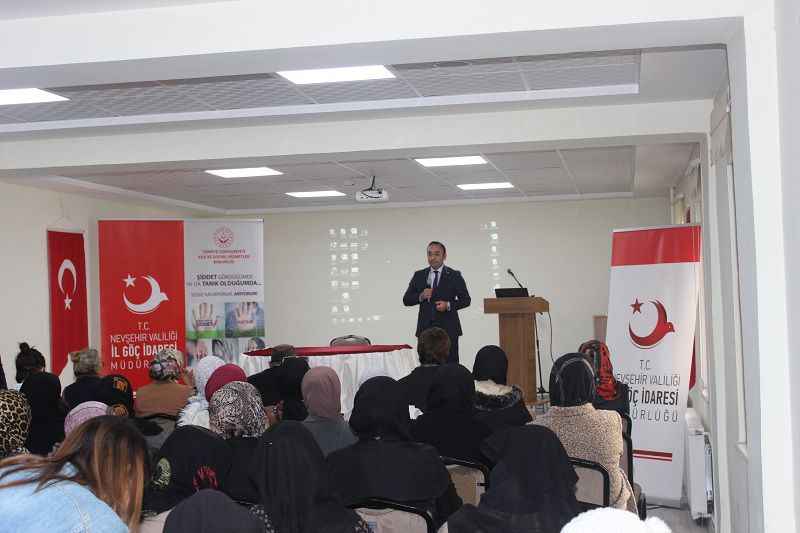 Nevşehir İl Göç İdaresi Müdür V. Enver Tutel ve Aile ve Sosyal Hizmetler İl Müdürü Halit Açar’ ın katılımıyla başlayan programda kadına şiddetin türleri, 6284 sayılı kanun, şiddetin hukuki süreçleri, Kades, Alo 183, YİMER 157 ve psiko-sosyal destek veren derneklerin faaliyetleri ile bilgilendirmeler yapılarak yabancıların soruları cevaplandırılarak program sonlandırıldı.