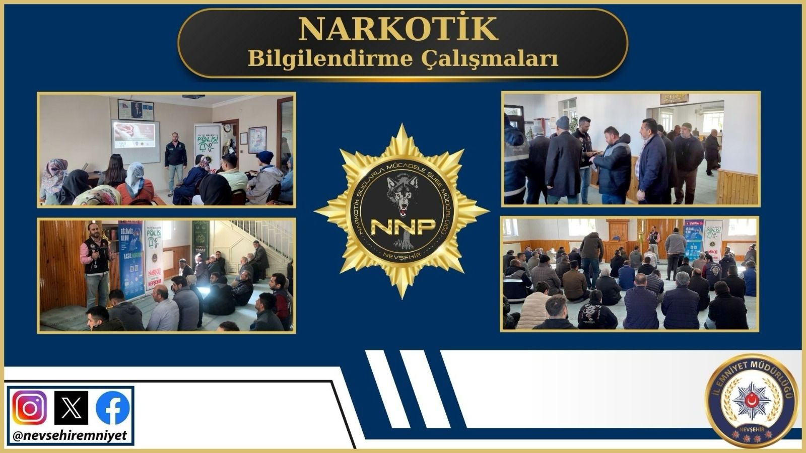 Nevşehir Narkotik Suçlarla Mücadele Şube Müdürlüğü tarafından Nevşehirli vatandaşlar bilgilendiriliyor. Narkotik Suçlarla Mücadele Şube Müdürlüğü tarafından bilgilendirme faaliyetleri çerçevesinde 12-19 Şubat tarihleri arasında ilimiz merkezinde bulunan sürücü kursunda kurs gören 25 anne ve anne adayına ve Merkez Kıratlıoğlu Mahallesi Çorapçıoğlu Camiinde Cuma namazına katılan 500 vatandaşa yönelik UYUMA Projesi, Narko Nokta, Narko Rehber, Foto Blok, Metamfetamin Modülü, En İyi Narkotik Polisi Anne ve Önleyici Faaliyetleri hakkında gerçekleştirilen 2 faaliyette toplamda 525 vatandaşa bilgilendirme yapıldı.