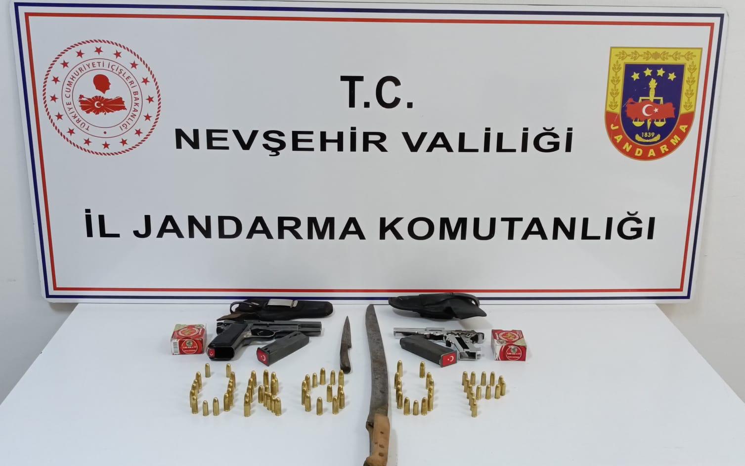 14 Ağustos 2024 tarihinde Ürgüp İlçesi Mazı Köyünde (1) şahsın ikamet ettiği adreste yapılan aramada; (1) adet Browning marka tabanca, tabancaya ait (2) adet şarjör, (43) adet 9 mm çapında fişek, (26) adet 7.65 mm çapında fişek, (1) adet 62 cm uzunluğunda kılıç, (1) adet 24 cm uzunluğunda hançer ele geçirildi.