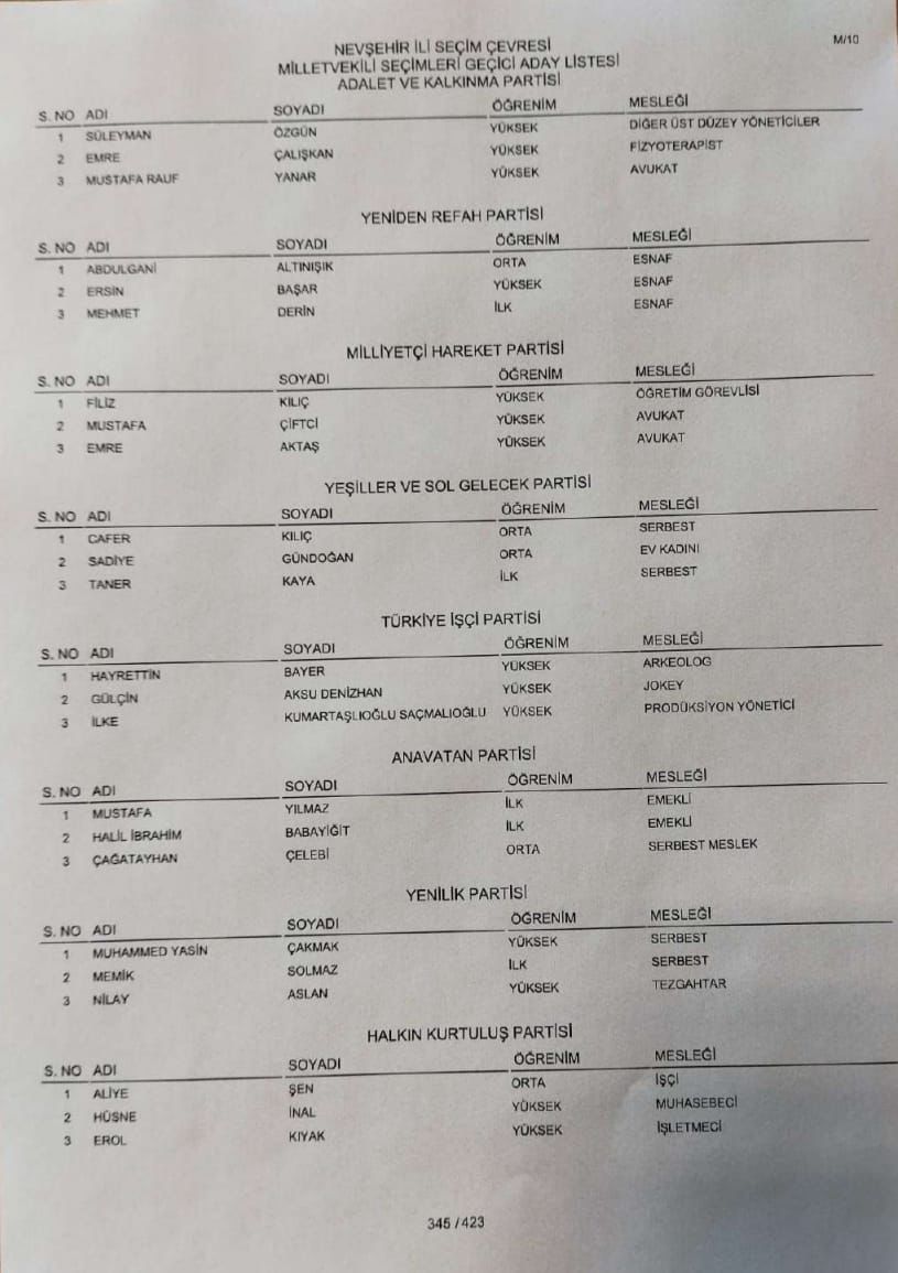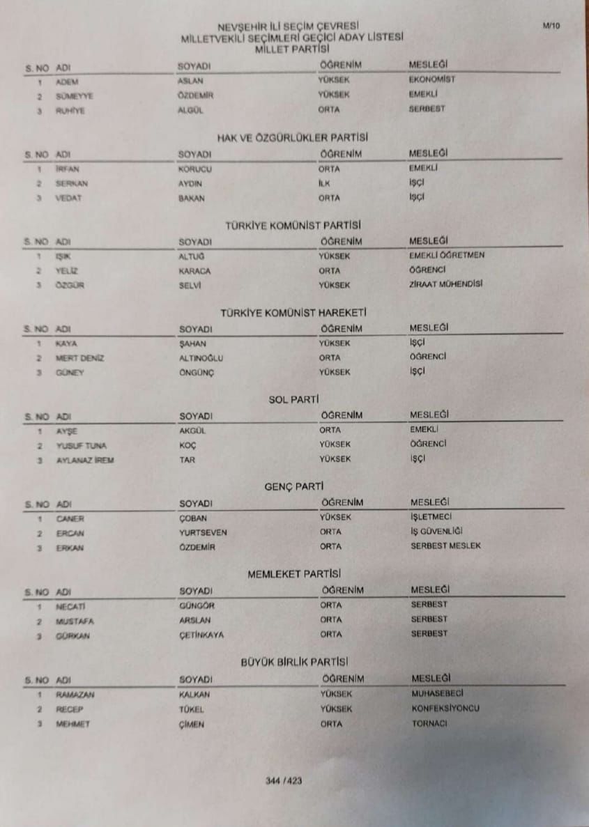 Adını Nevşehir kamuoyunun ilk kez duyduğu birçok ismin yer aldığı milletvekili adayları listesinde Memleket Partisinin adaylarının üçünde serbest meslek sahibi, Yeniden refah partisinin üç adayının da esnaf olduğu gözleniyor.