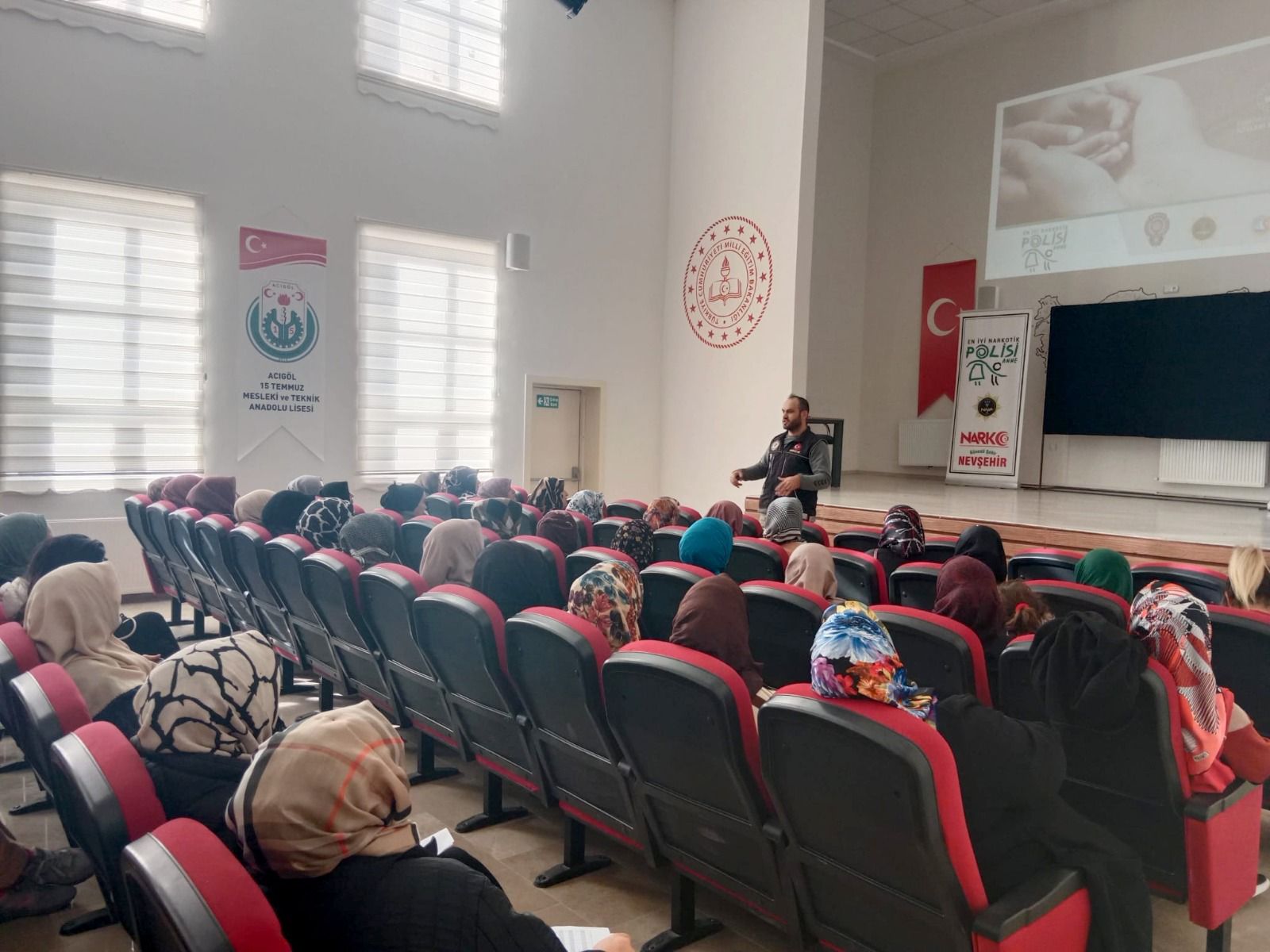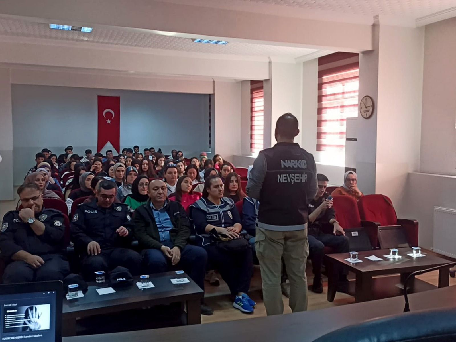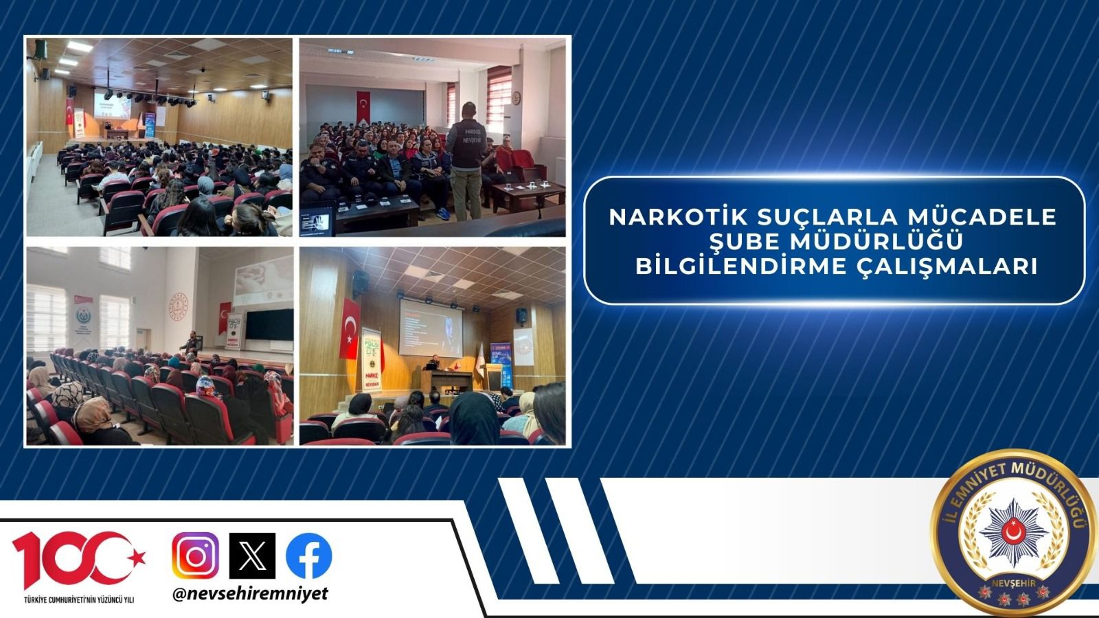 Narkotik Suçlarla Mücadele Şube Müdürlüğü tarafından bilgilendirme faaliyetleri yapıldı. Bu çerçevede 6 -13 Kasım 2023 tarihleri arasında Kozaklı ve Gülşehir Meslek Yüksek Okulu öğrencilerine toplamda 580 katılımcıya, Acıgöl Halk Eğitim Merkezinde kurs gören 100 katılımcıya el broşürleri dağıtılarak UYUMA Projesi, Narko Nokta, Narko Rehber, Foto Blok, Metamfetamin Modülü, En İyi Narkotik Polisi Anne ve Önleyici Faaliyetler hakkında toplamda 680 vatandaşa bilgilendirme yapıldı.