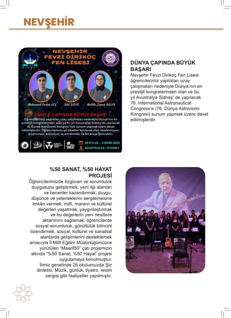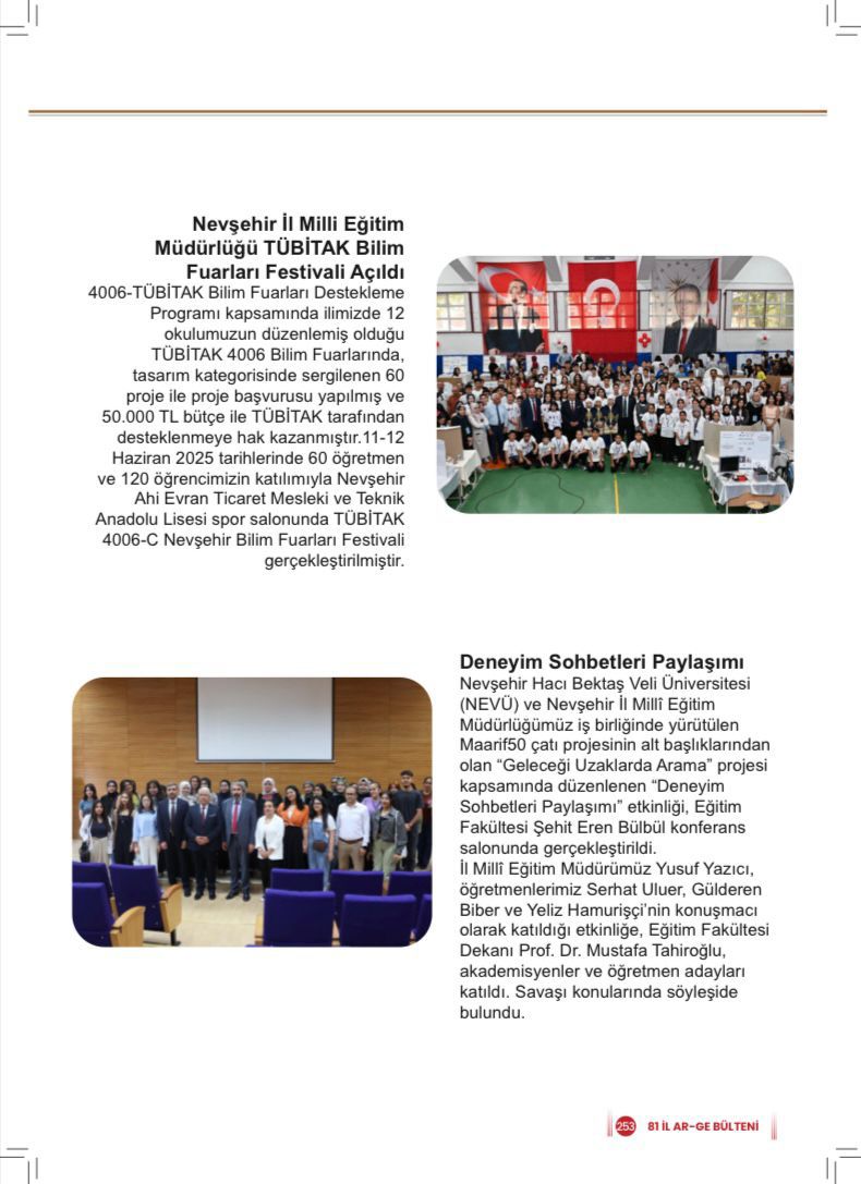 Bu kapsamda yapılan çalışmaların görünürlüğünün artırılması amacıyla, Millî Eğitim Bakanlığı Strateji Geliştirme Başkanlığınca hazırlanan AR-GE birimlerinin 81 ilde yürütülen eğitime dayalı projelerin ve faaliyetlerin yer aldığı “81 İl AR-GE Ocak-Haziran 2025 Bülteni” yayımlandı. Bültende, Nevşehir İl Millî Eğitim Müdürlüğü AR-GE birimi tarafından hazırlanan çalışmalara da yer verildi.