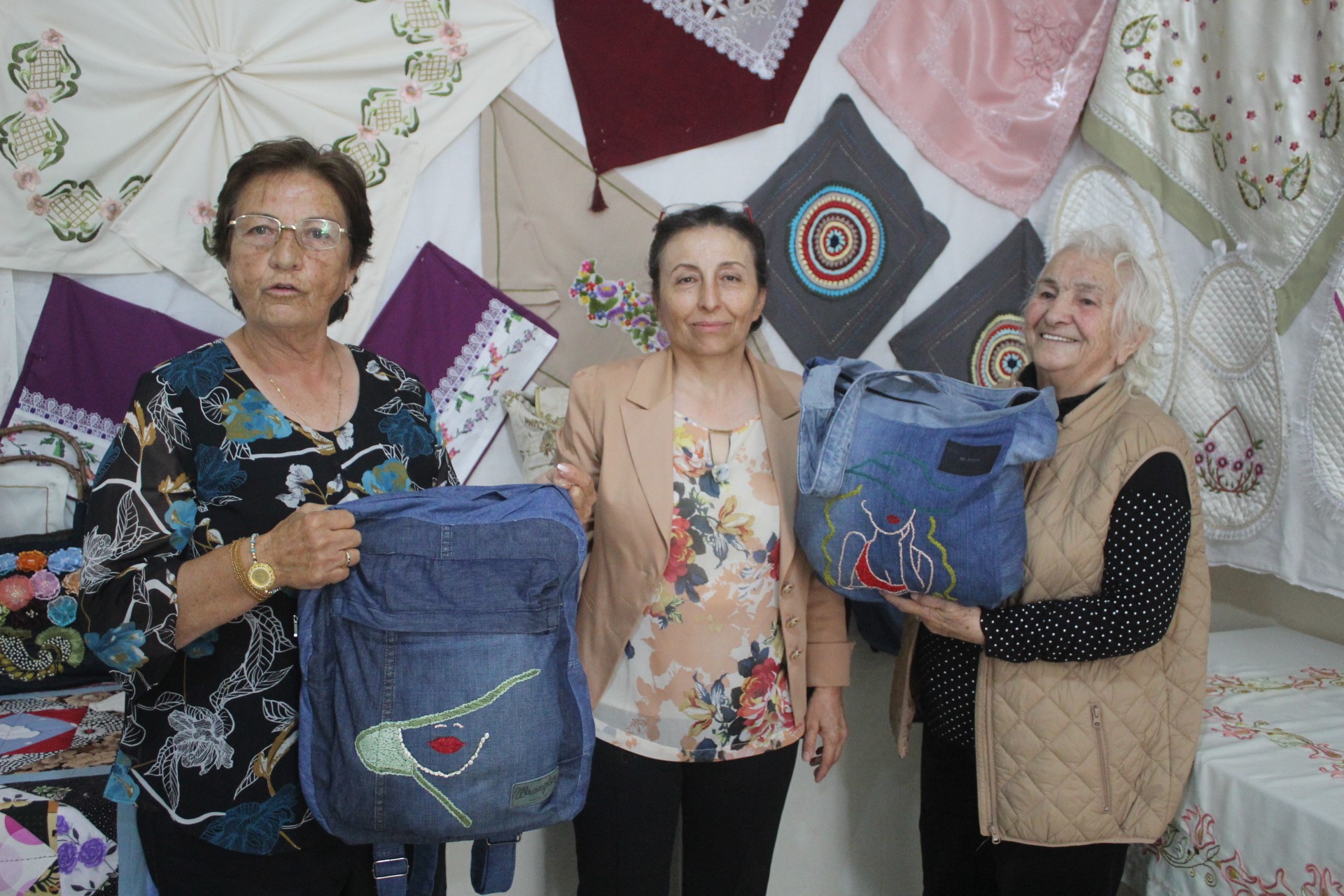 Eski kotları değerlendirip çanta yapan Kursiyer Naciye Uçar da, “Evde ki eski kot pantolonları getirdik, çanta, kırlent ve masa örtüsü diktik. Katıldığım kursta panolar, çiçekli saksılar yaptık. Gördüğünüz el emeği göz nuru bütün ürünleri iğne ile tek tek işledik.” şeklinde konuştu.