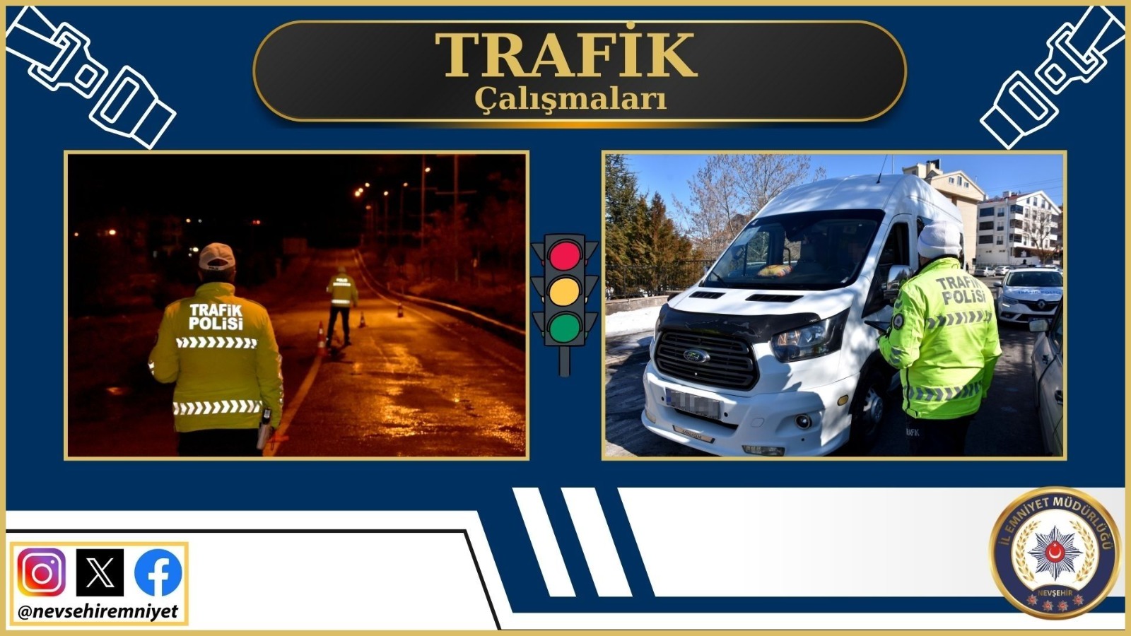 Nevşehir İl Emniyet Müdürlüğü Trafik birimlerince 9.395 araç sürücüsünün kontrolü yapıldı. Denetimlerde 15 araç trafikten men edilirken hız ihlalinden 1.202, kırmızı ışık ihlalinden 322, hatalı parktan 173, emniyet kemeri takmamaktan 114, taşıma kanununa muhalefetten 140 ve diğer maddelerden 638 olmak üzere 2.589 araç/sürücüsüne cezai işlem uygulandı. Ayrıca 11 yaralanmalı trafik kazasında 24 vatandaş yaralandı.