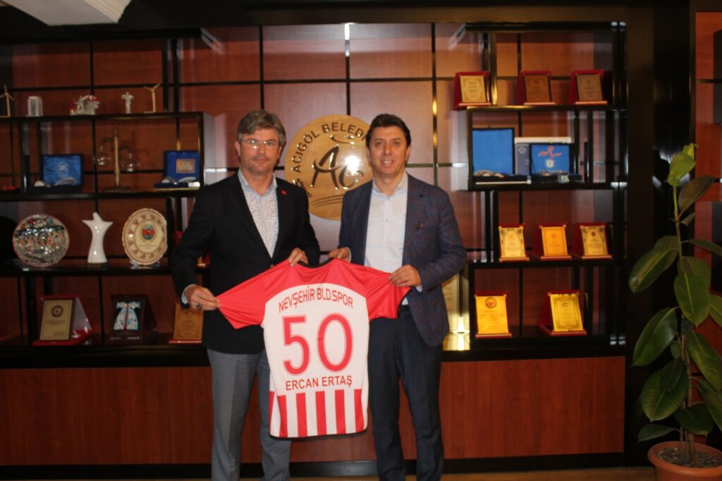 TFF. 3. Lig’deki temsilci Nevşehir Belediyespor’a destek sağlayan Acıgöl Belediye Başkanı Ercan Ertaş ve Gülşehir Belediye Başkanı Fatih Çiftçi’yi ziyaret eden kırmızı-beyazlı ekibin yöneticileri, belediye başkanlarına kulübün formasını hediye etti.