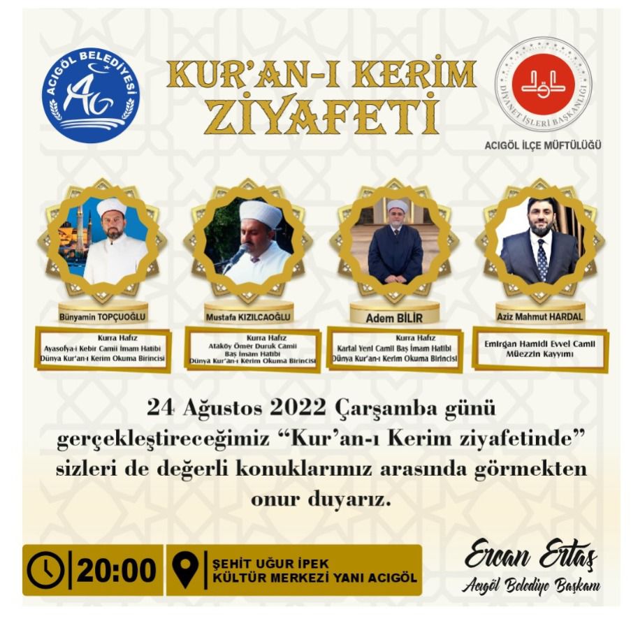 Acıgöl belediyesi ve Acıgöl ilçe müftülüğü organizasyonu ile Ayasofya-i Kebir Camii İmam Hatibi Dünya Kur’an-ı Kerim  Okuma Birincisi Kurra Hafız Bünyamin Topçuoğlu, Ataköy Ömer Duruk Camii Baş İmam Hatibi Dünya Kur’an-I Kerim Okuma Birincisi Kurra Hafız Mustafa Kızılcaoğlu, Kartal Yeni Camii Baş İmam Hatibi Dünya Kur’an-ı Kerim Okuma Birincisi Kurra Hafız Adem Bilir, Emirgan Hamidi Evvel Camii Müezzin Kayyımı Aziz Mahmut Hardal’ın katılımıyla 24 Ağustos 2022 Cumartesi günü Saat 20:00 da Şehit Uğur İpek Kültür Merkezi Yanı Acıgöl de gerçekleştirecek ‘Kur’an-ı Kerim Ziyafetine tüm Nevşehirliler davet edildi.