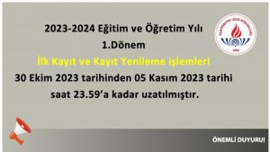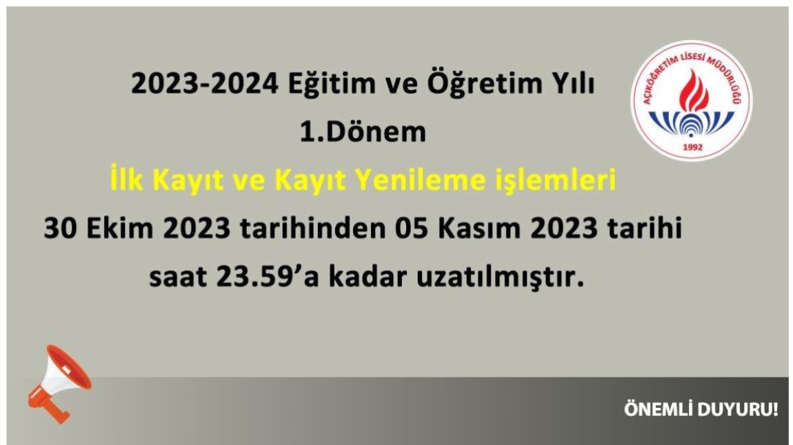 Ürgüp Halk Merkezi Açık öğretim okulları 2023-2024 eğitim ve öğretim yılı 1. dönem ilk kayıt ve kayıt yenileme işlemleri 15 Eylül 2023 – 16 Ekim 2023 tarihleri arasında tamamlandı. Ancak görülen lüzum üzerine 1. dönem ilk kayıt ve kayıt yenileme işlemleri 30 Ekim 2023 tarihinden 05 Kasım 2023 tarihi saat 23.59’a kadar uzatılmıştı.
