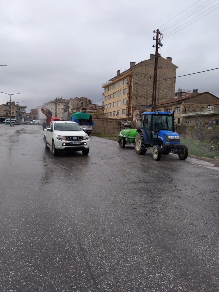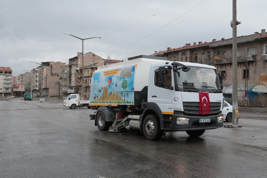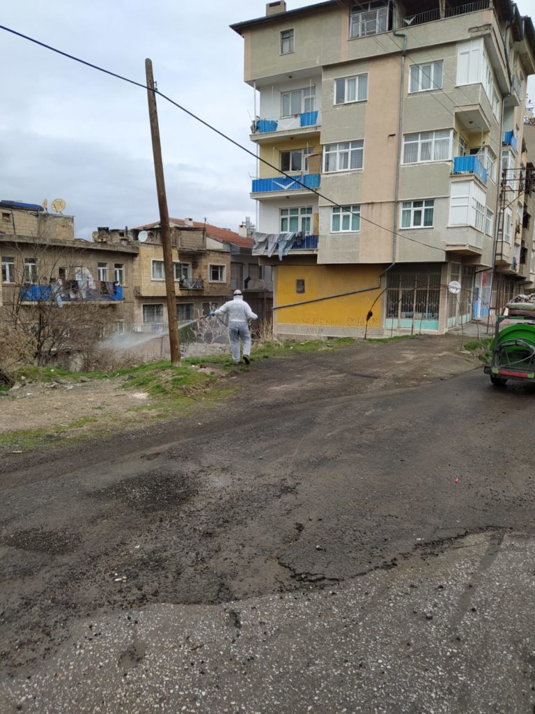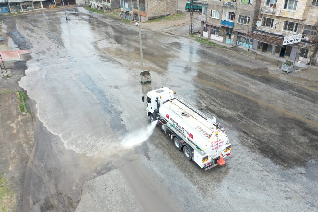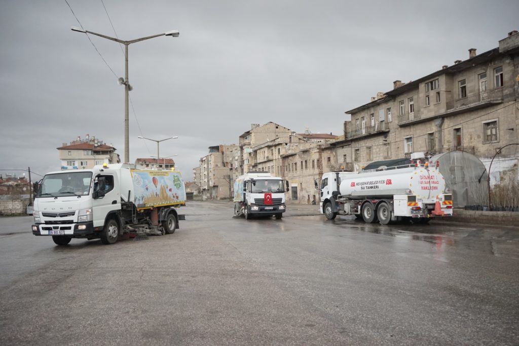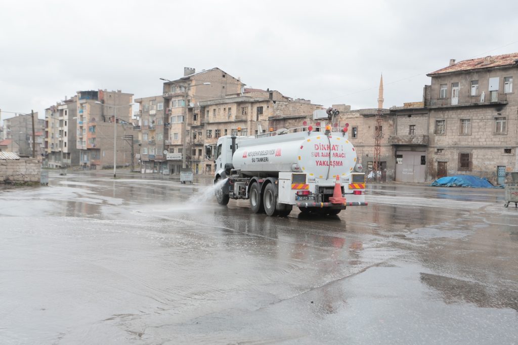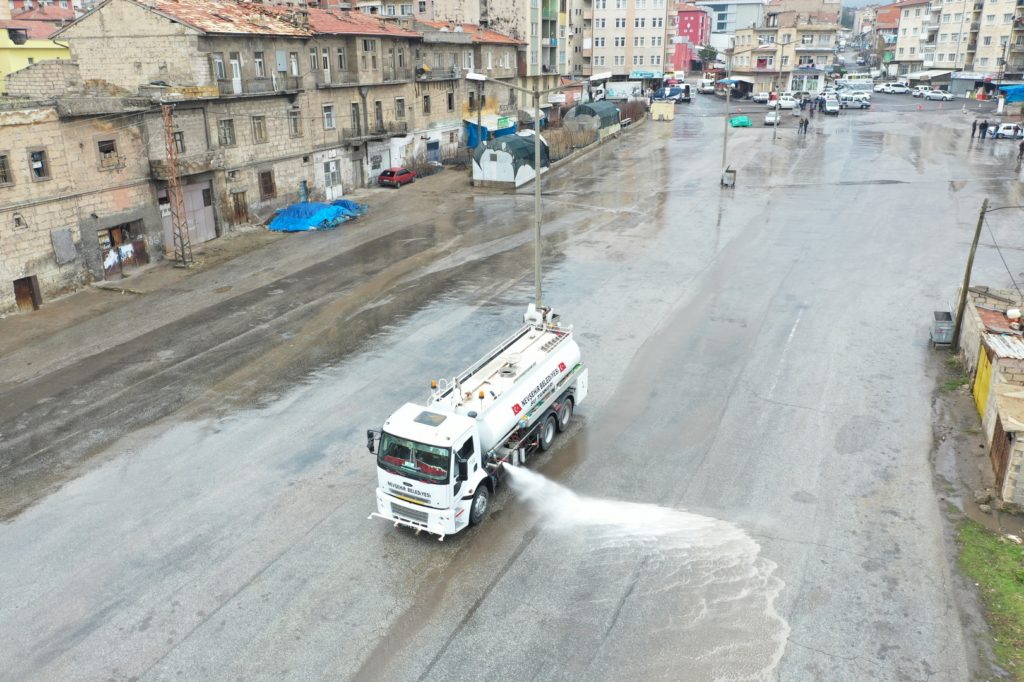 Çalışmalar kapsamında, ilk olarak pazar alanını vakumlu süpürme araçları ile temizleyen ekipler, daha sonra köpüklü su ile tüm alanı yıkayarak dezenfekte etti.