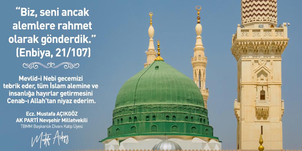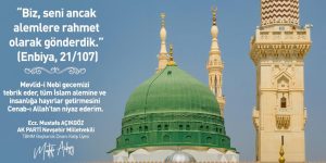 Bu mübarek gün ve gece, salgın hastalıklarla, savaşlarla, açlıkla, yoklukla zor günler geçiren dünyada; gelecek adına umutla dolu olduğumuz şu dönemlerde gönül coğrafyalarımızda, insanlığın vicdanında yeniden bir uyanışa vesile olmasını temenni eder, Mevlid-i Nebi Gecemizi ve bu yılki teması “Peygamberimiz, Cami ve İrşat” olan, insanların gönlünü kazanarak tebliğe çok değer veren Peygamber Efendimiz, bizim için en güzel örnektir. Milli ve manevi değerlere sahip; Kur’an ve sünnet ışığında, vatana ve millete hayırlı hizmetler edecek nesiller yetişmesine de vesile olması dileğiyle Mevlid-i Nebi Haftamızı en kalbi duygularımla kutlarım.