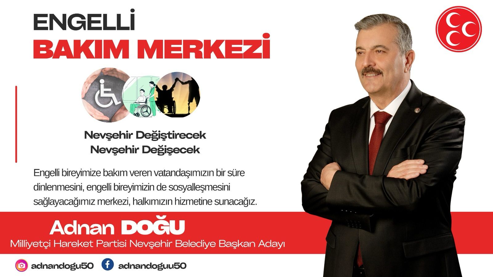 Engelli bireylerin yaşamlarını kolaylaştırmak adına Nevşehir’de adımlar atılması gerektiğini söyleyen Milliyetçi Hareket Partisi Nevşehir Belediye Başkan Adayı Adnan Doğu, Engelli bireylerimize bakım veren vatandaşlarımızın bir süre dinlenmesini, engelli bireyimizin de sosyalleşmesini sağlayacağımız merkezi, halkımızın hizmetine sunacağız.” dedi.