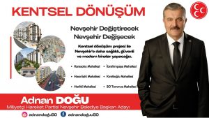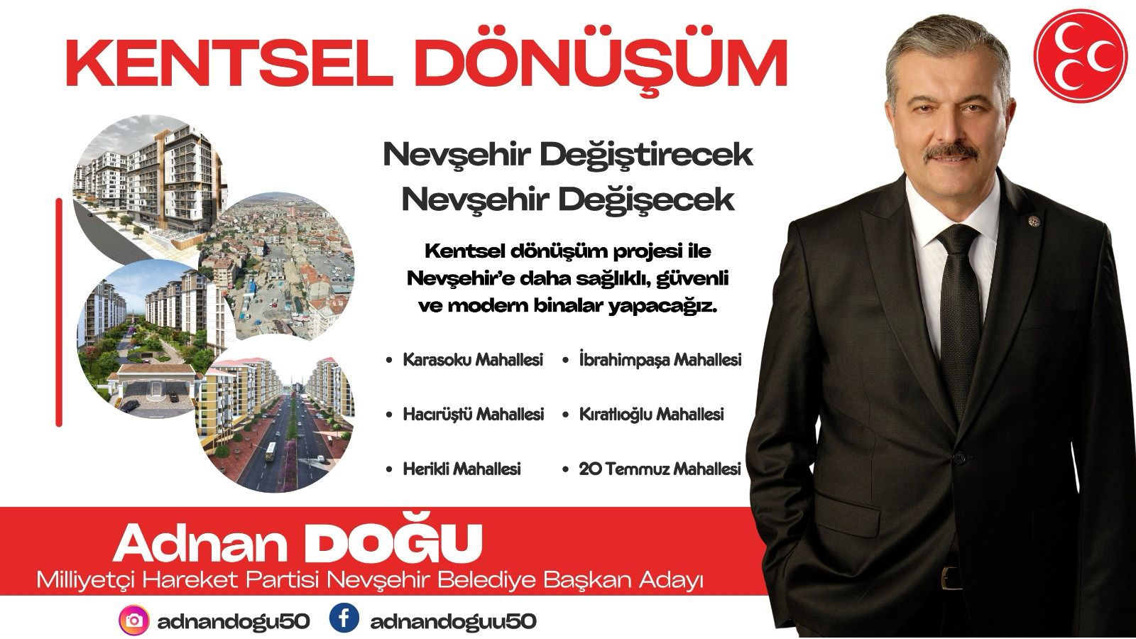 Kentsel Dönüşüm Projeleri hakkında da bilgiler aktaran Adnan Doğu, “Bunun yanı sıra Kentsel Dönüşüm projemizi göreve geldiğimizde hayata geçireceğiz. Bu alanlara ise modern binalar yapıp şehrin dizaynını yeniden kurmayı hedefliyoruz. Bu vesile ile 6 mahallede yapılacak yıkım ile Nevşehir çarşı merkezi bambaşka bir görünüm ile çevre illeri kendine özendirecek” dedi.