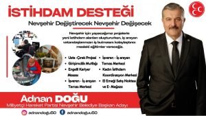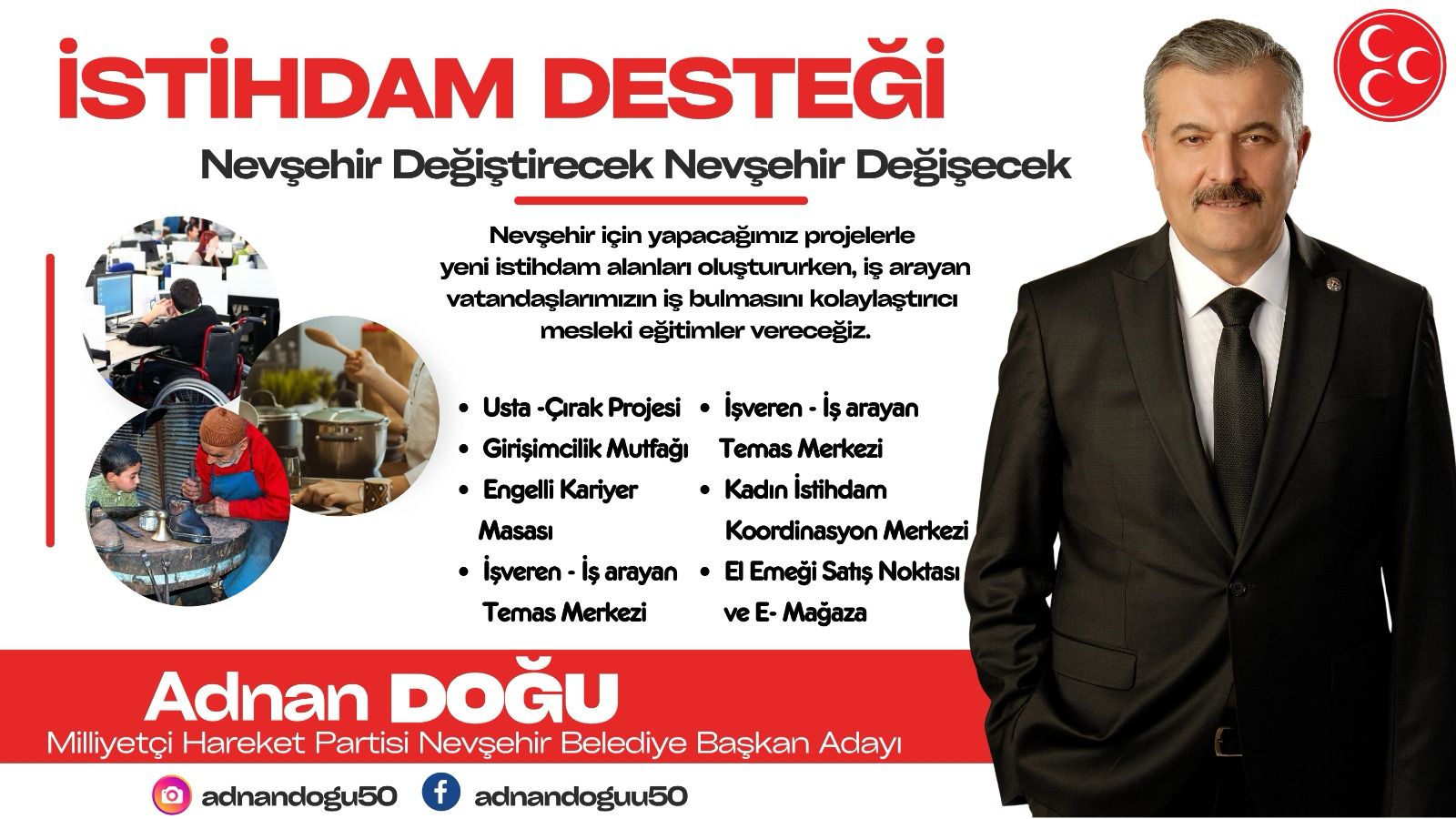 31 Mart seçimlerine adım adım yaklaşırken Milliyetçi Hareket Partisi (MHP) Nevşehir Belediye Başkan Adayı Adnan Doğu şehrin çehresinin değiştirecek güzel projeler ile gündeme gelmeye devam ediyor. Doğu bu kez 3 projesini daha kamuoyu ile paylaştı. Bu projelerden ilki “İstihdam Desteği” oldu. “Nevşehir Değiştirecek, Nevşehir değişecek” sloganı ile yapılan yeni istihdam alanları oluşturulacağının sözü veren Adnan Doğu, “İş arayan vatandaşlarımızın iş bulmasını kolaylaştırmak için mesleki eğitimler verilecek. Bunun için ise Usta-Çıkara projesi, İşveren-iş arayan, Girişimcilik Mutfağı, Temas Merkezi, Engelli Kariyer Masası, Kadın istihdam Koordinasyon Merkezi, İşveren-İş arayan temas merkezi, El Emeği Satış Noktası ve e Mağaza olacak. Bu projenin şehre büyük bir katma değer katacağına inanıyoruz.” Dedi.