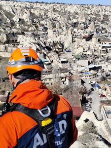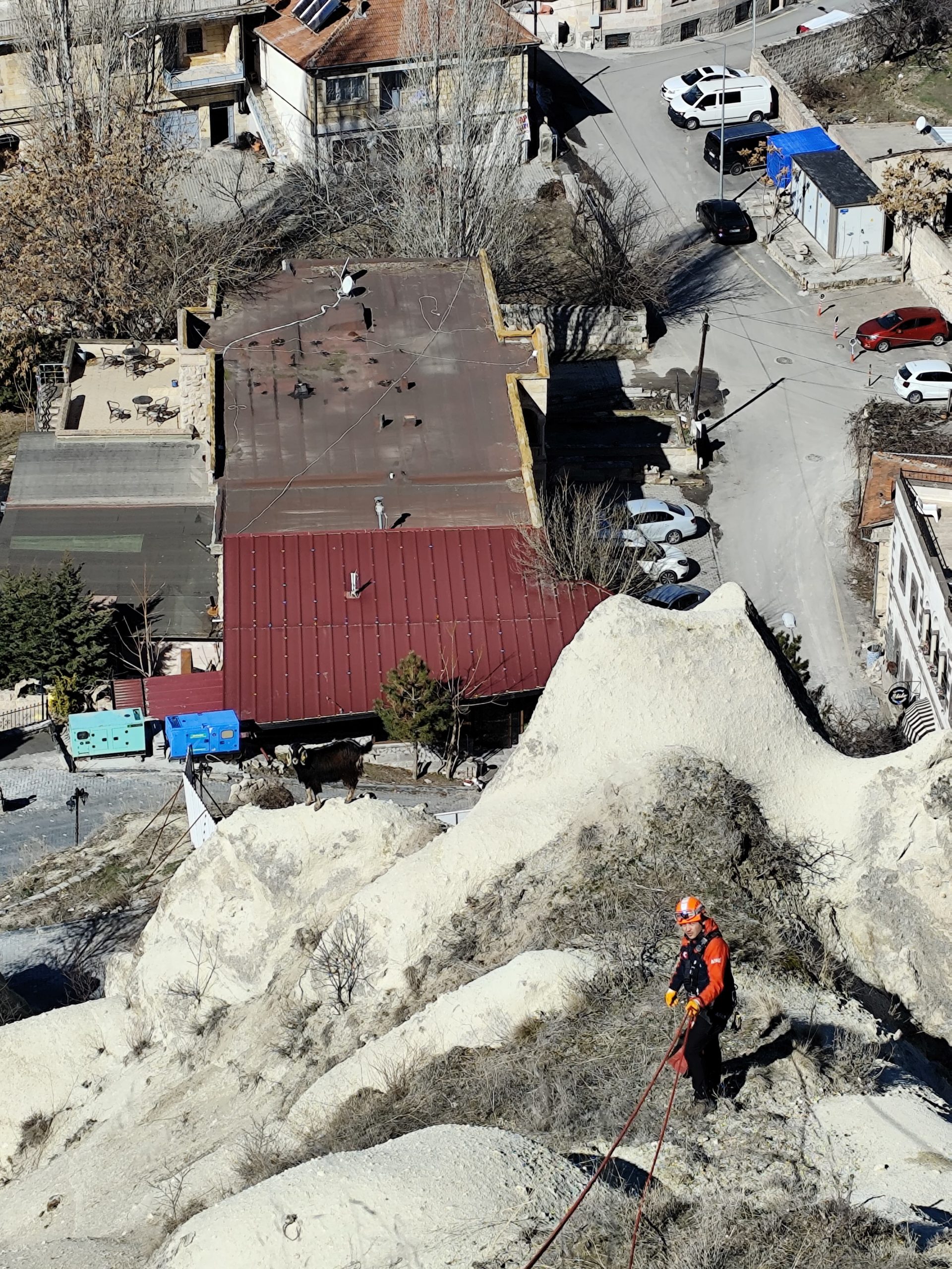 Nevşehir’in Göreme Beldesi’nde bulunan Aydın Kırağı Tepesi’nde meydana gelen olayda, 2 keçinin mahsur kaldığı ihbarı üzerine AFAD ekipleri harekete geçti. Zorlu doğa koşullarına rağmen hızla olay yerine intikal eden ekipler, tepede mahsur kalan keçileri başarılı bir kurtarma operasyonuyla güvenli bir şekilde kurtardı.