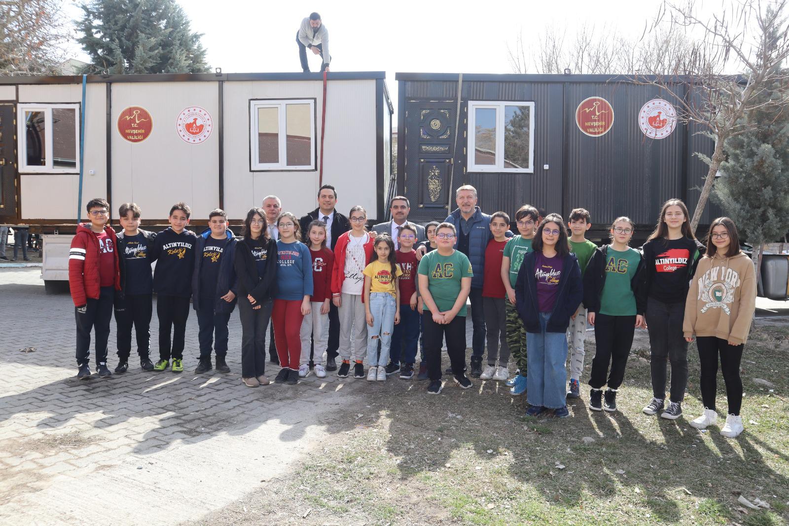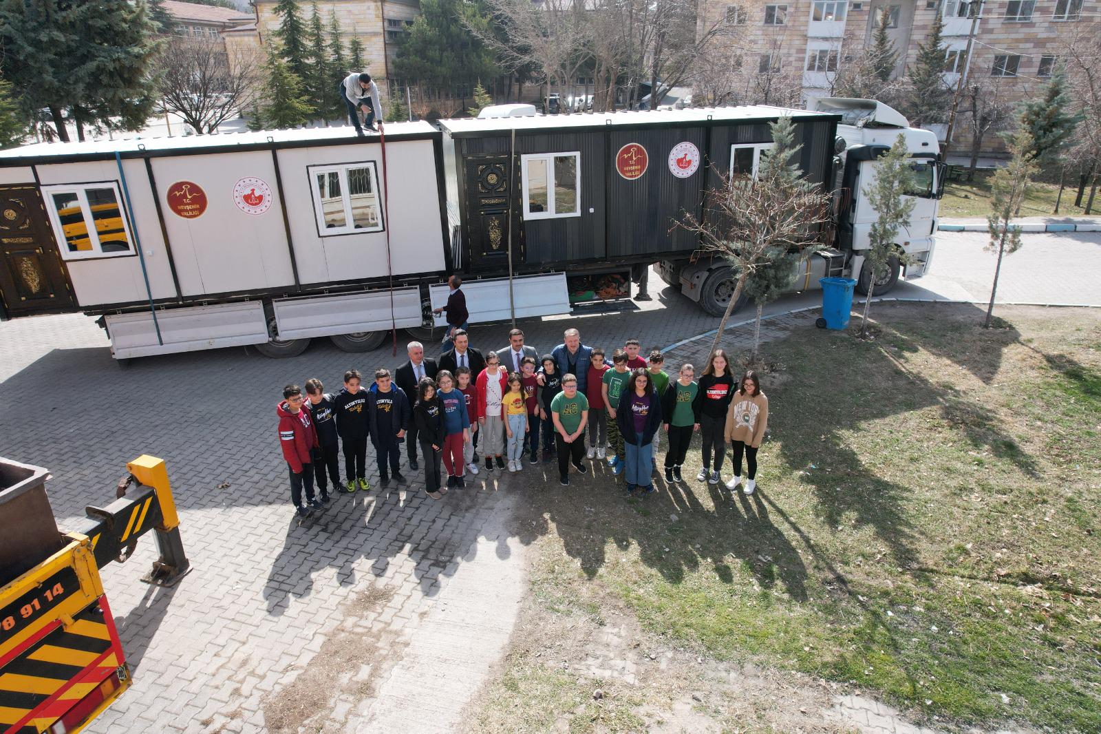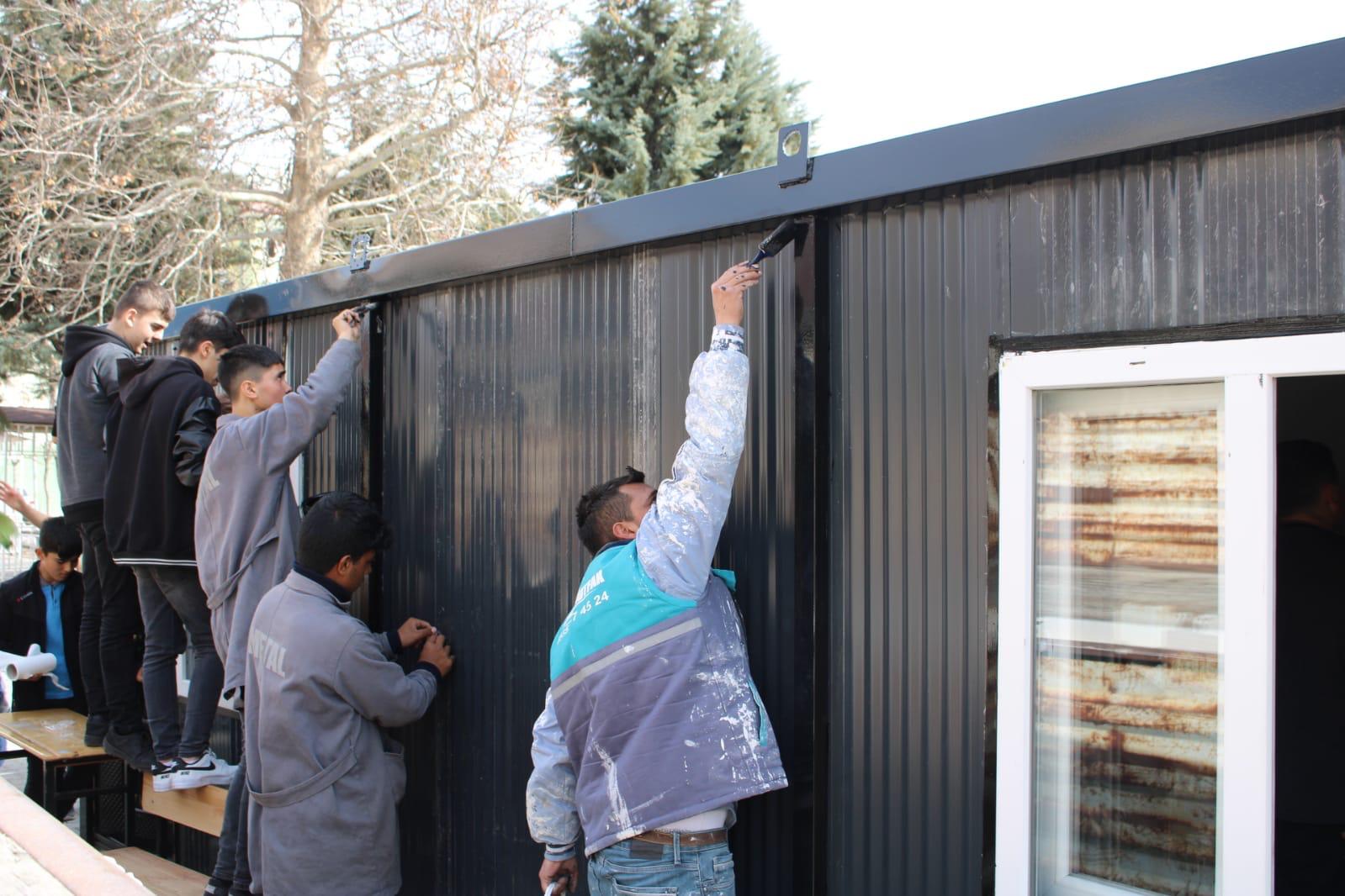 Temin edilen konteynerlere, Nevşehir Mesleki ve Teknik Anadolu Lisesi öğretmen ve öğrenciler tarafından boyama ve tesisat işlemleri uygulandı. Sınıf ortamı için gerekli olan masa, sandalye, öğretmen masası, yazı tahtası gibi gereçler temin edildi.