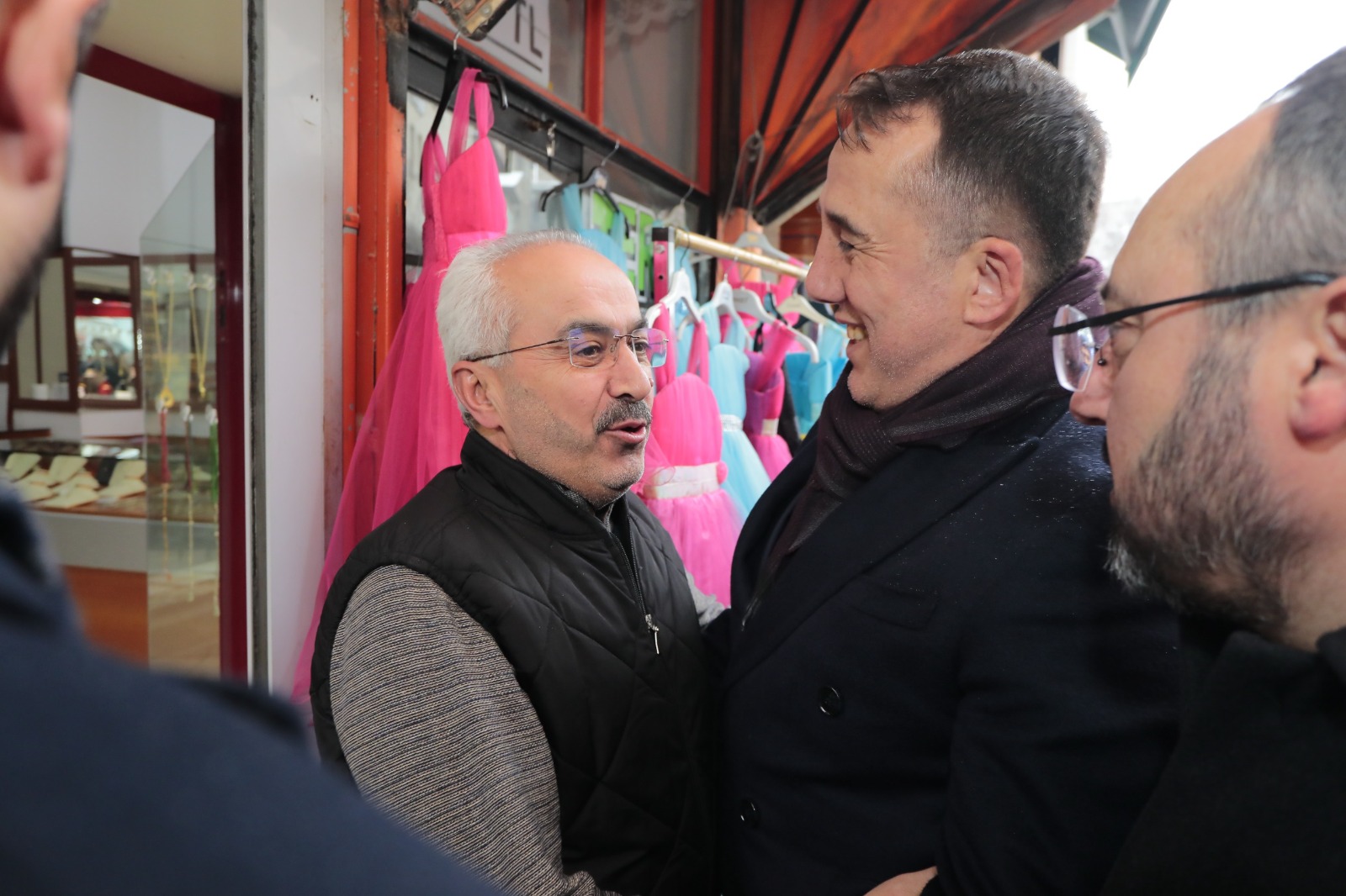 Cami Cedit Mahallesi üzerinde bulunan işyerlerini ziyaret ederek esnaflarla kucaklaşan AK Parti heyeti, 31 Mart Mahalli İdareler Seçimleri için destek istedi.