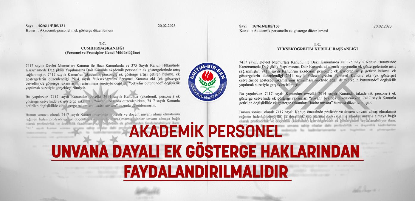 Açıklamada; “Eğitim-Bir-Sen olarak, Cumhurbaşkanlığı ve YÖK’e başvurarak akademik personelin ek gösterge rakamlarının “unvan” bazında yeniden düzenlenmesini talep ettik.