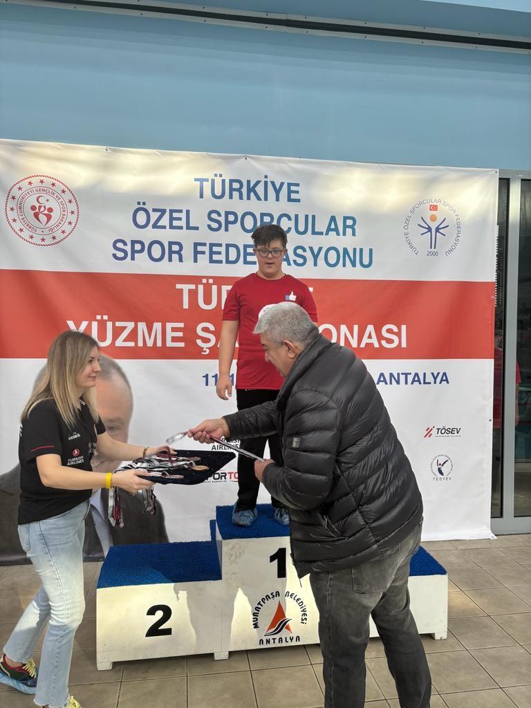 Kapadokya Özel Eğitim Uygulama Okulu lll. Kademe Müdürlüğü 9. sınıfta öğrenim gören down sendromlu öğrenci Alperen KOYUTÜRK, Antalya ilinde yapılan Türkiye Özel Sporcular Spor Federasyonu Türkiye Yüzme Şampiyonasında altın madalya kazanarak büyük bir başarı elde etti.