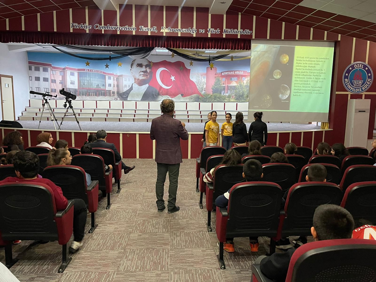Prof. Dr. Meydan, evrenin gizemlerini, yıldızların oluşum sürecini ve gökyüzü gözlemlerinin bilimsel önemini öğrencilerle paylaştı. Seminerin ardından öğrenciler, öğretmenleri eşliğinde okul bahçesinde kurulan teleskoplarla gökyüzünü gözlemleme fırsatı buldular.